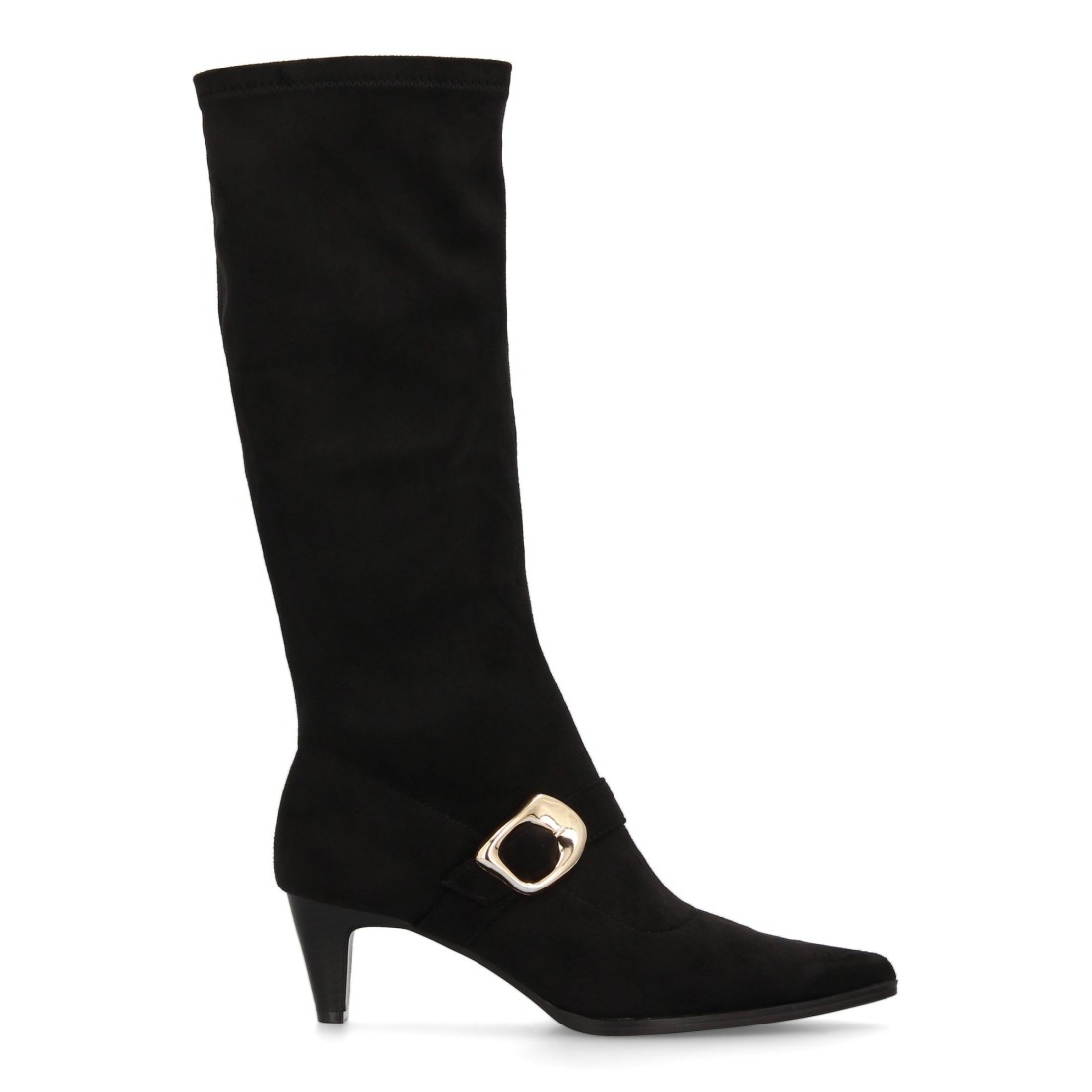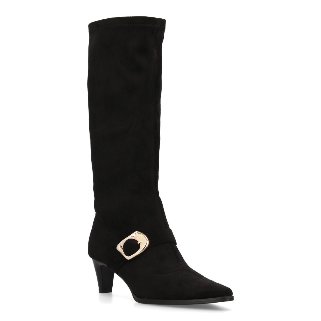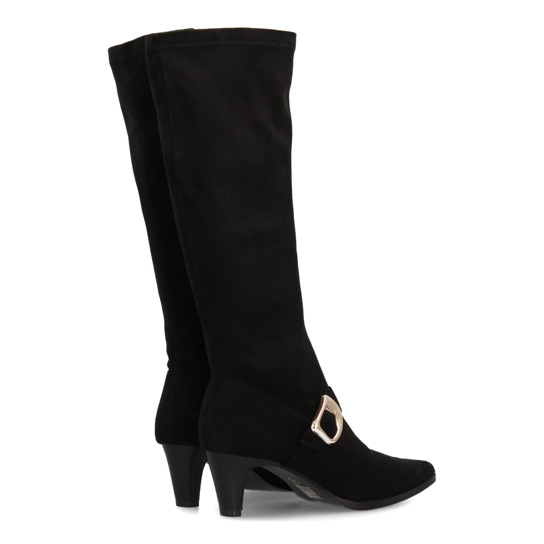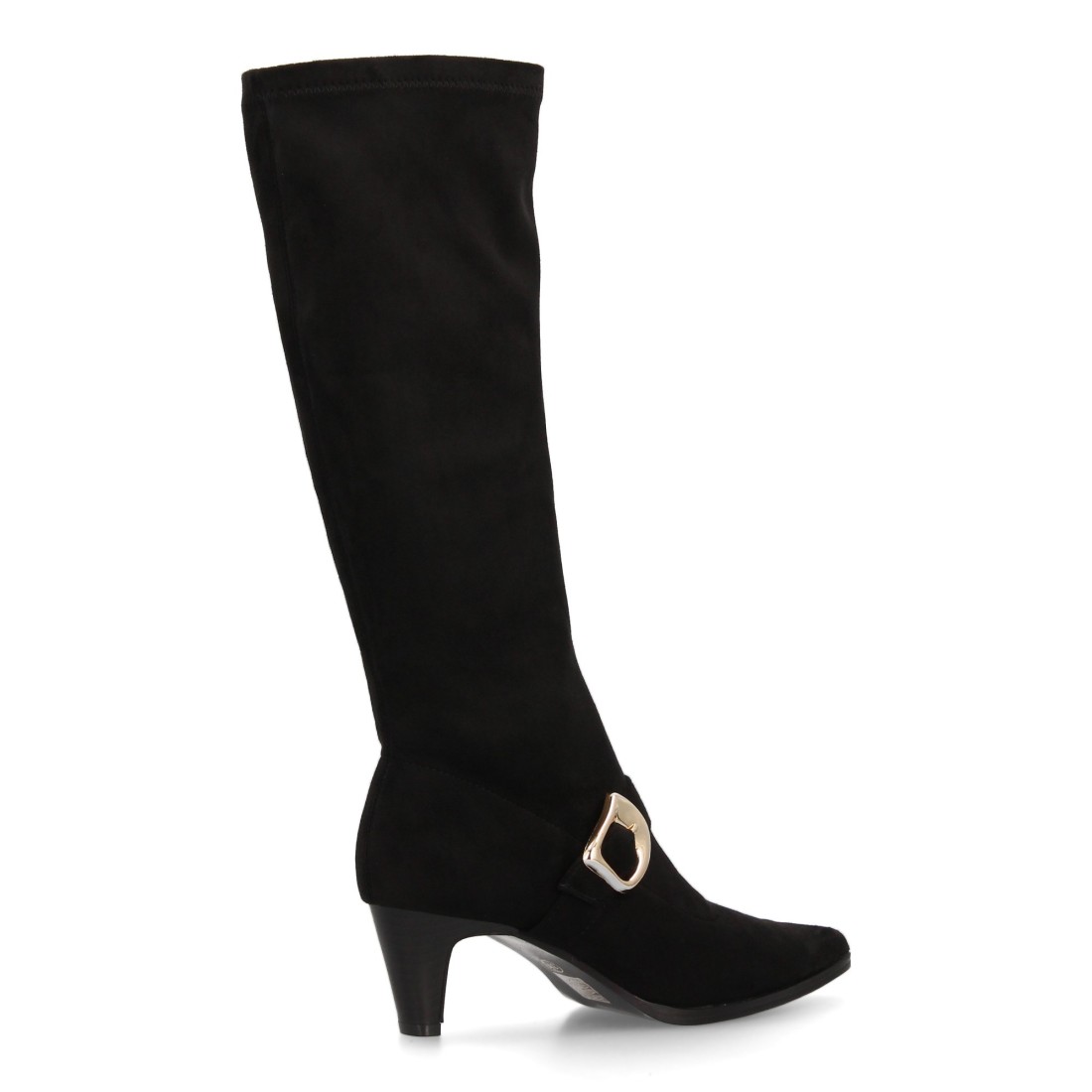 Bota alta para mujer con punta fina y tacón, estampado liso elegante. Hebilla grande decorativa. Ideal temporada otoño invierno.