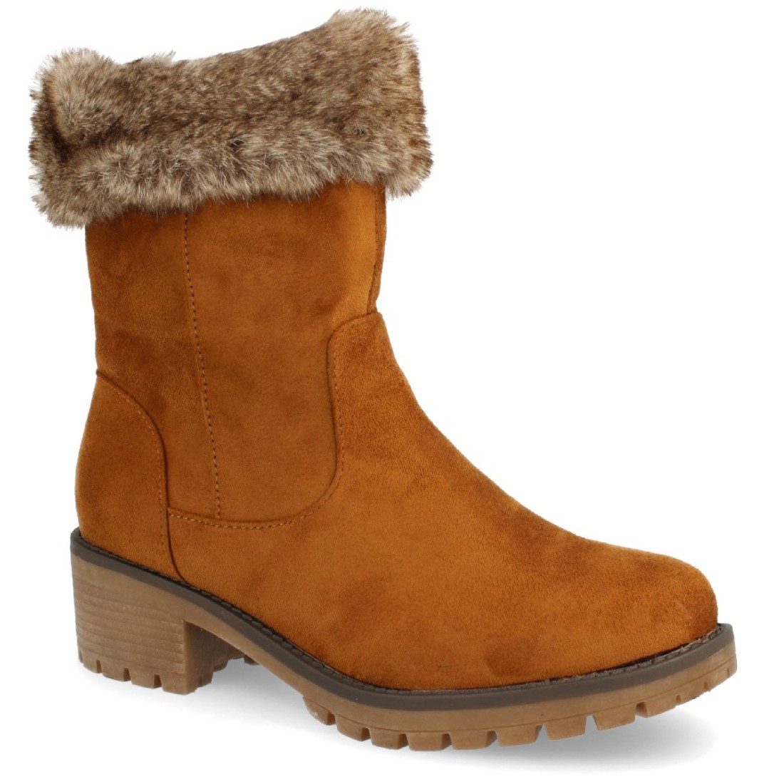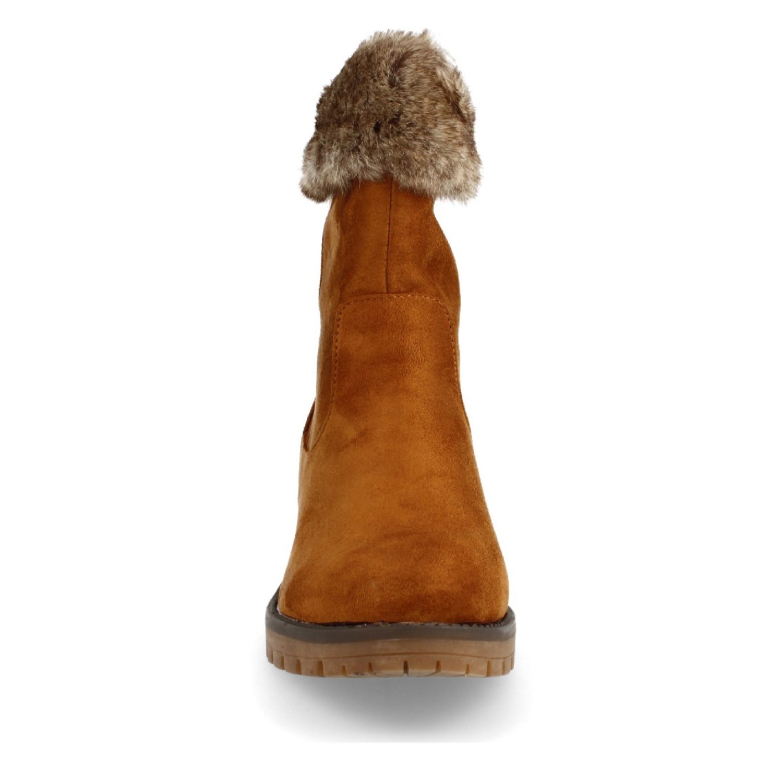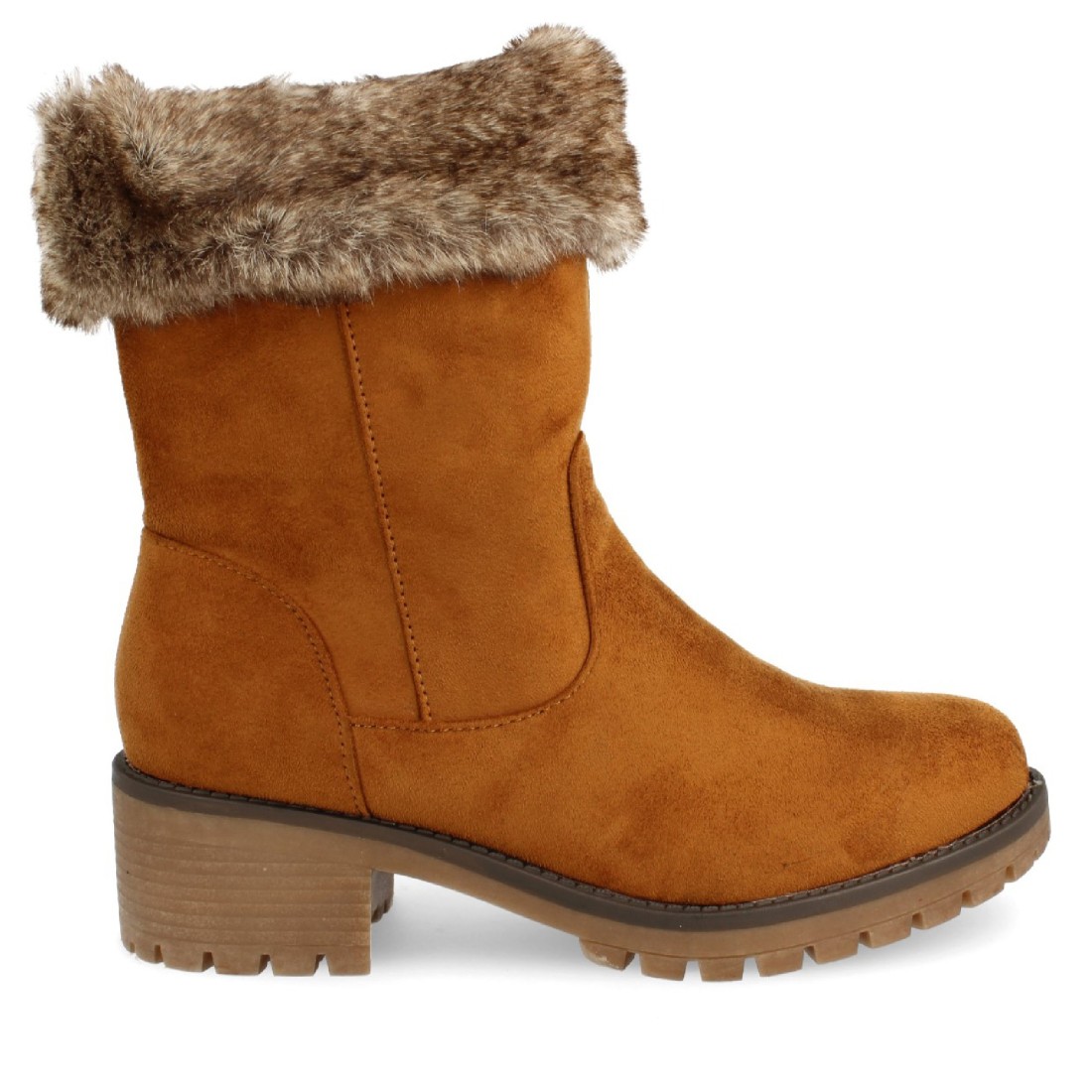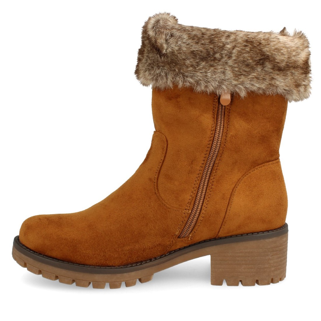 Boín plano de punta redonda con forro de pelo visto y cierre de cremallera en el interior. Altura de tacón: 4,5 cm.