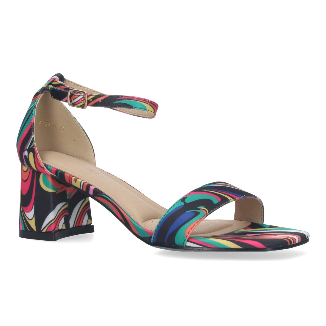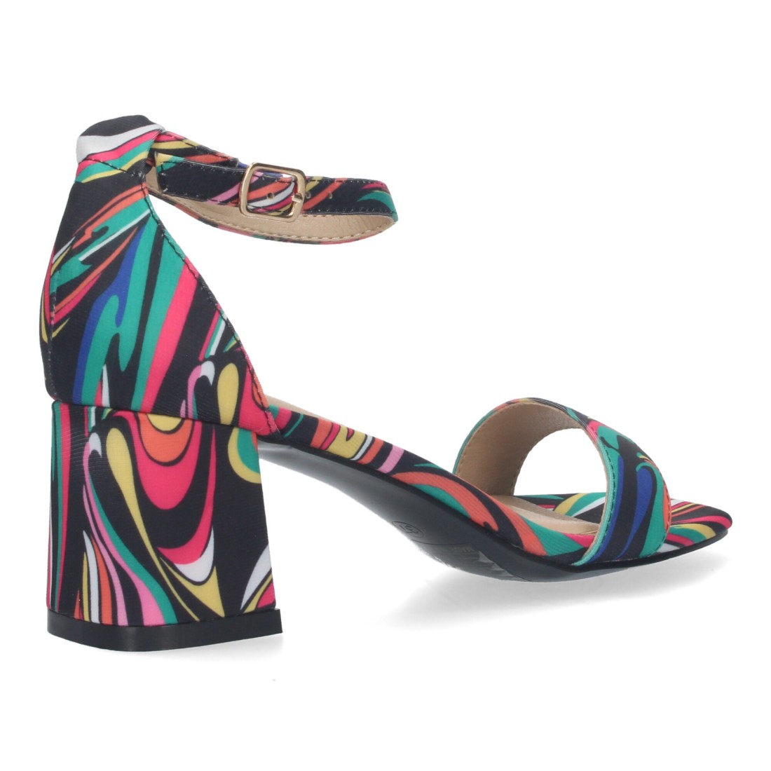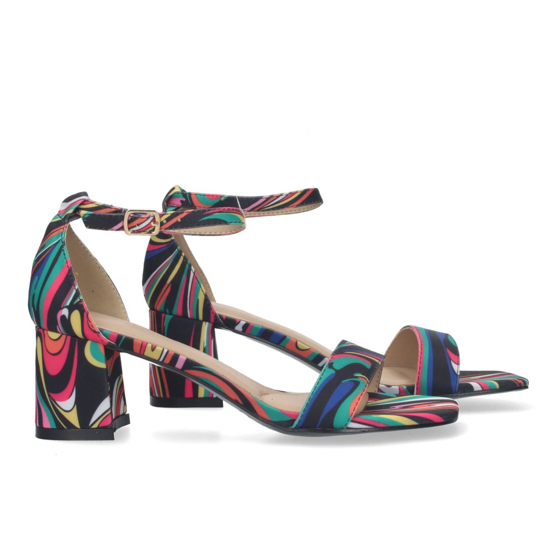 Sandalia de Tacon para Mujer, Comoda, con Pala Fina, y Cierre Ankle Strap de Hebilla, Estampado multicolor.