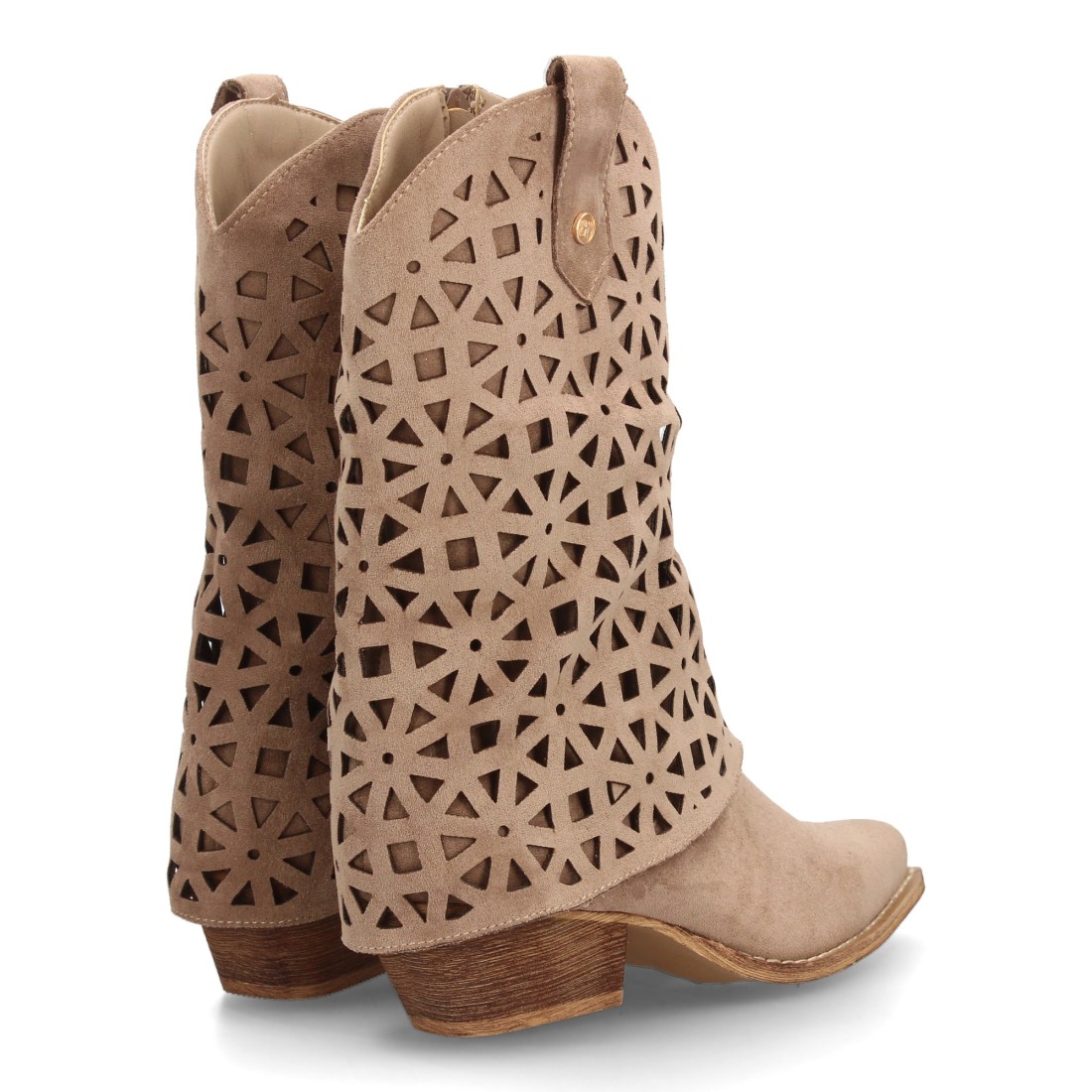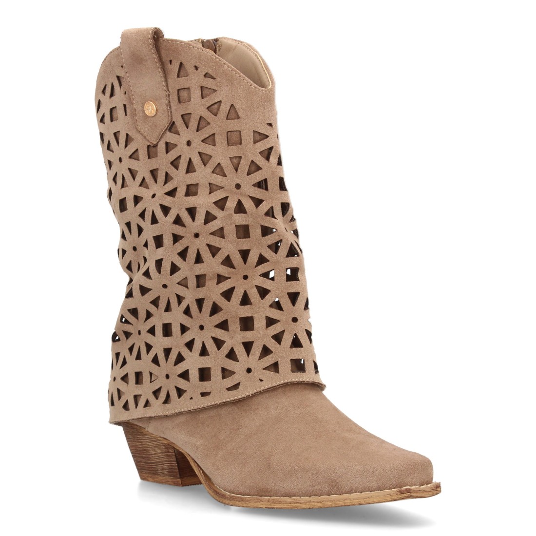 Botas cowboy de media caña para mujer diseño troquelado de formas geométricas que aporta frescura, punta fina y tacón cubano bajo. Estampado liso, Ideal para el día a día.