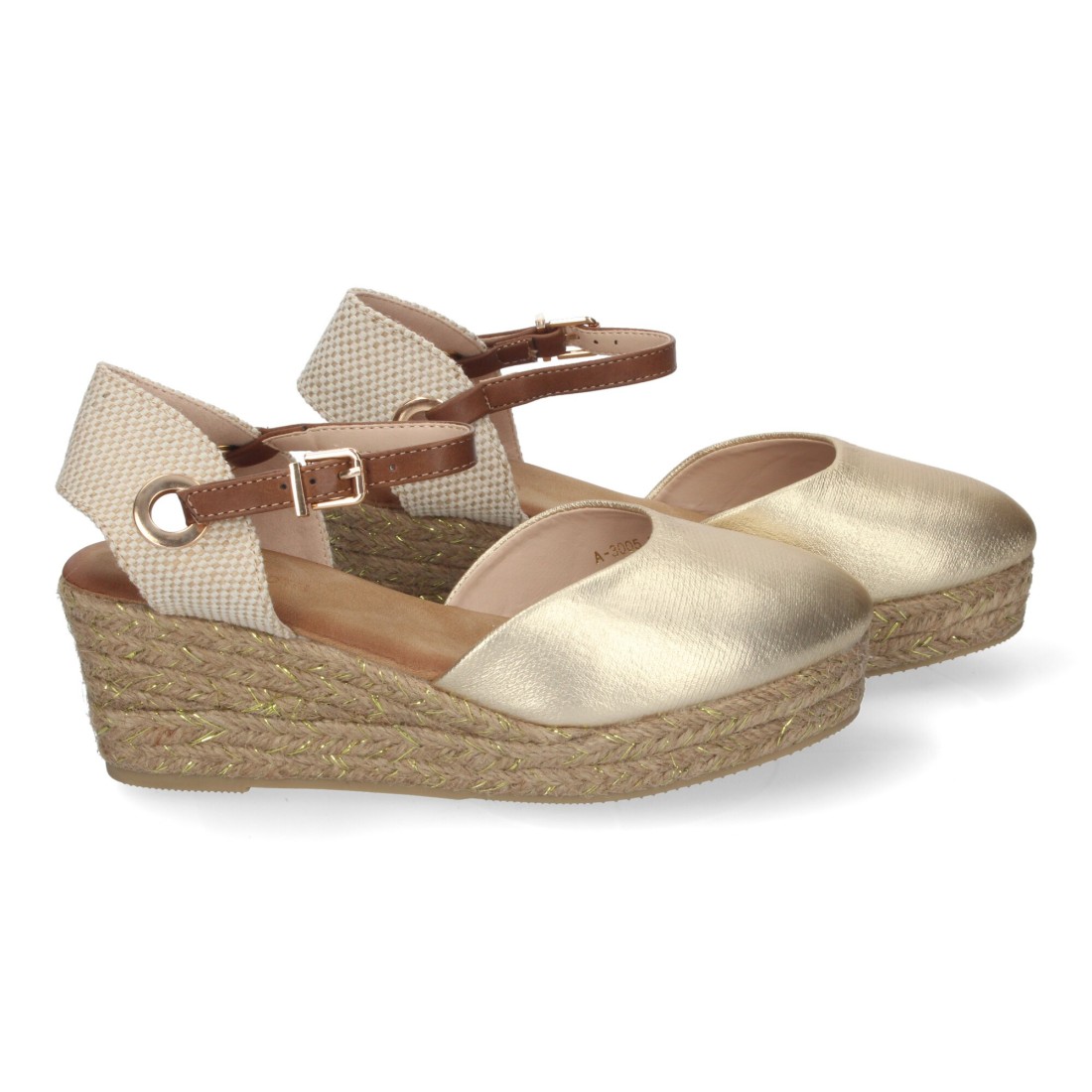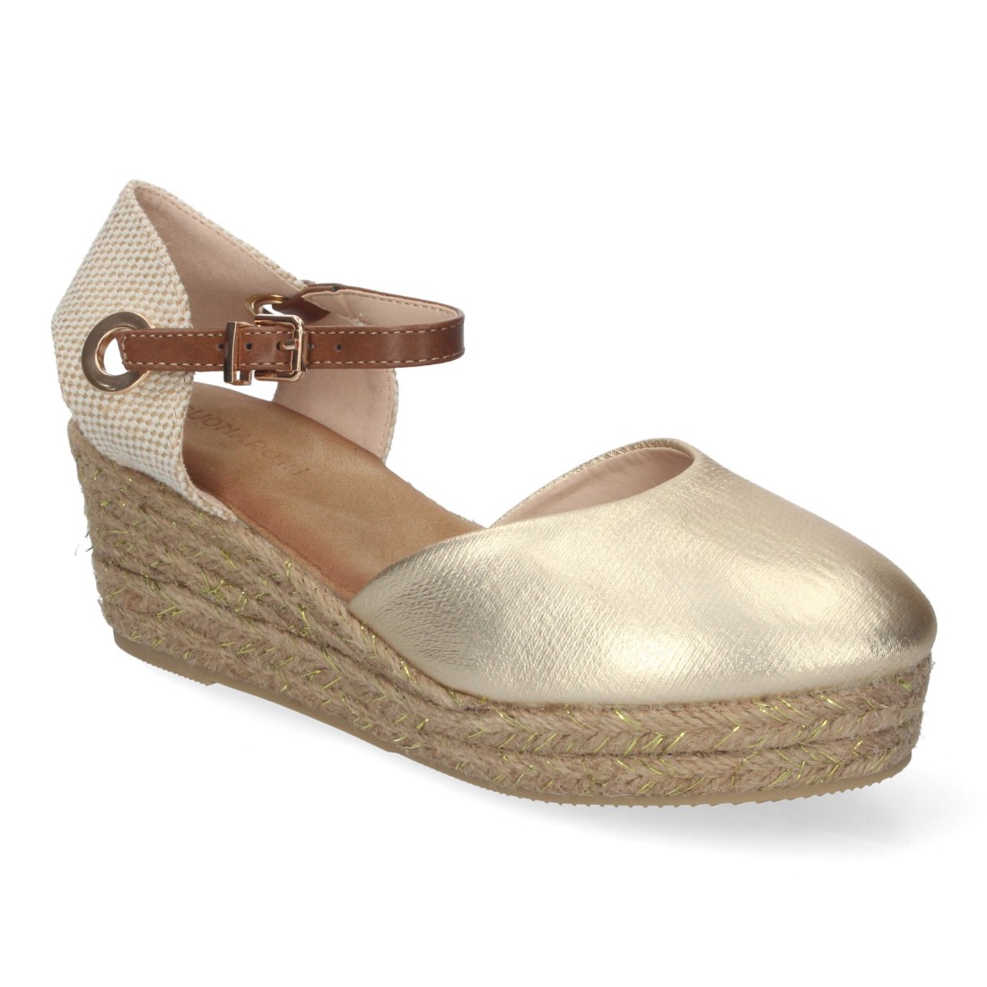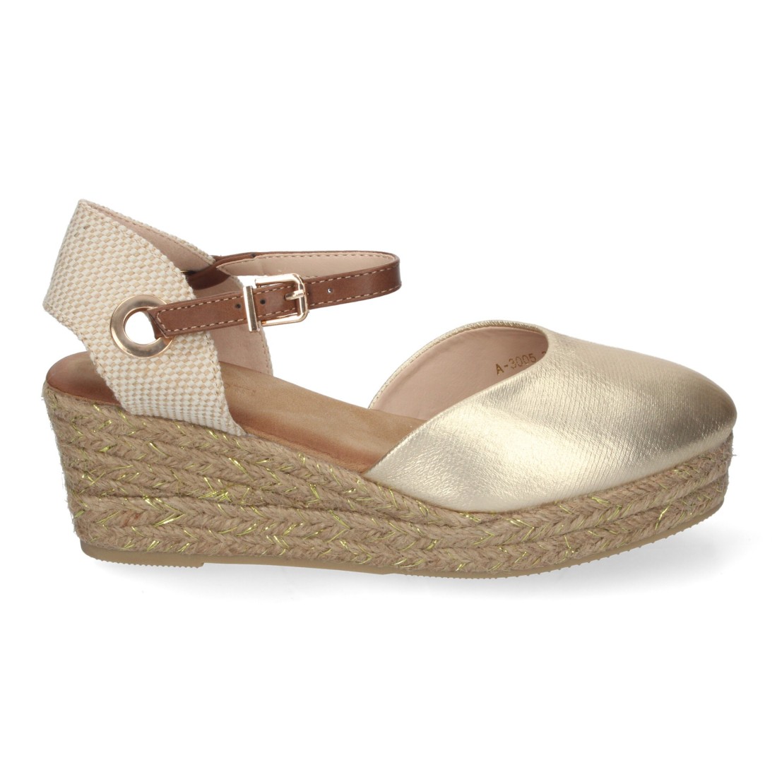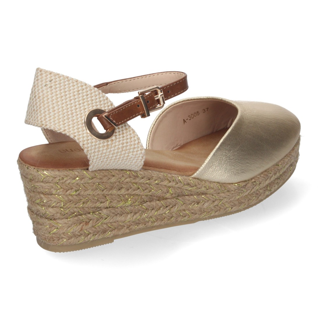 Sandalia de Cuña de Yute para Mujer, Cómodas y Elegantes, Pala Cerrada, Yute con Adornos Brillantes y Cierre de Hebilla Ajustable.