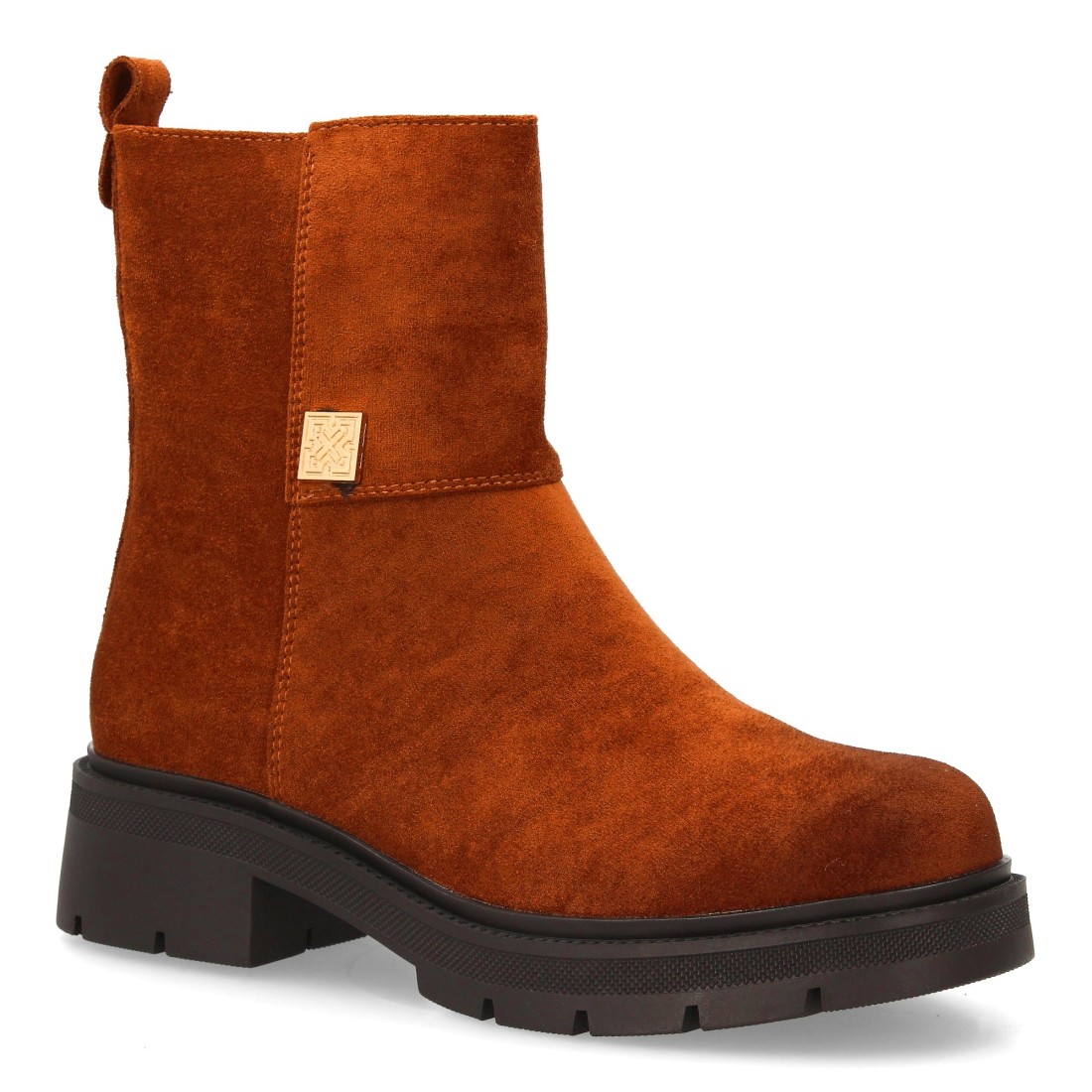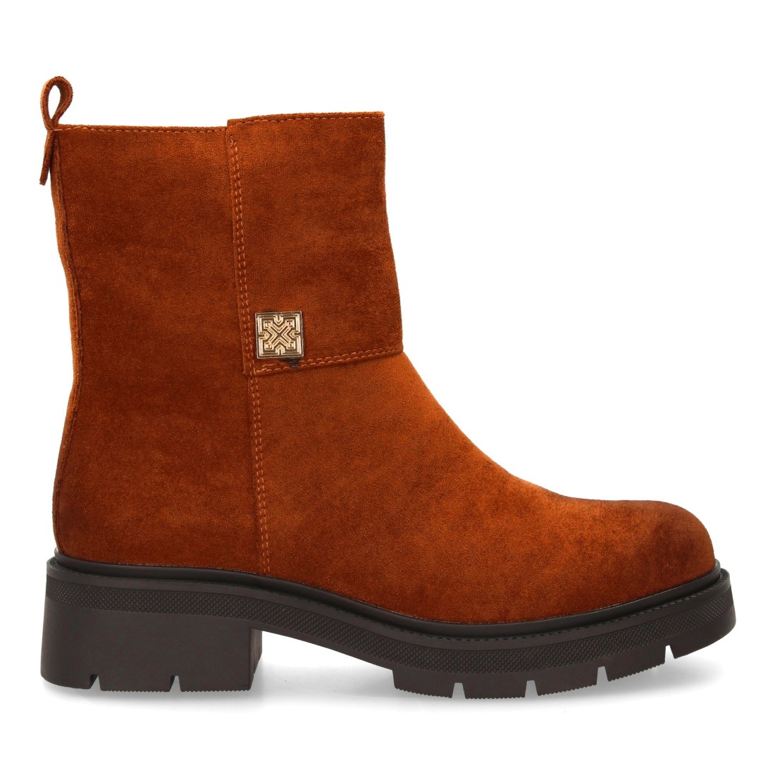 Botín moderno con estampado liso.Incorpora un adorno metálico lateral. Suela robusta con plataforma. Ideal para mujer en temporada Otoño Invierno. Cierre de cremallera