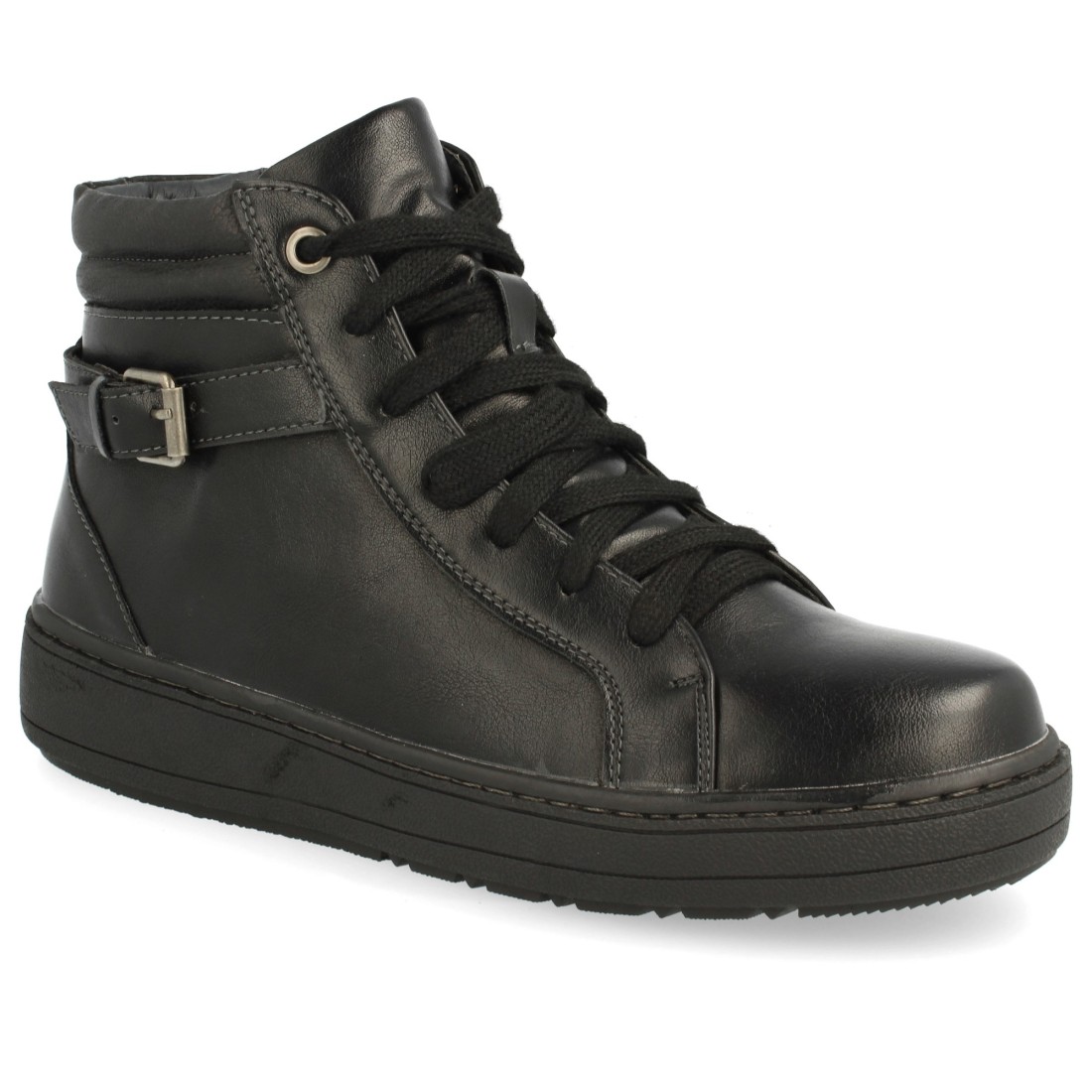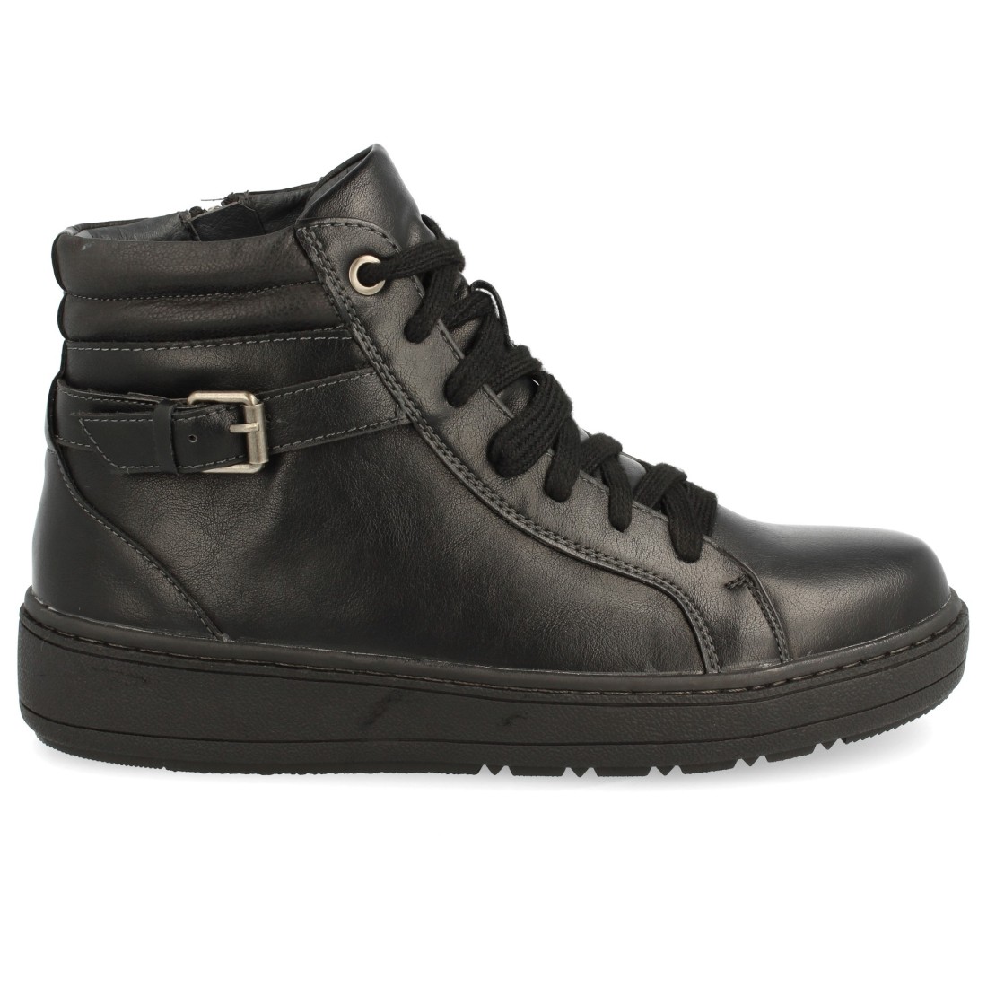 Botín plano de punta redonda con cordones planos al tono, y correa en el tobillo con hebilla metálica como detalle.