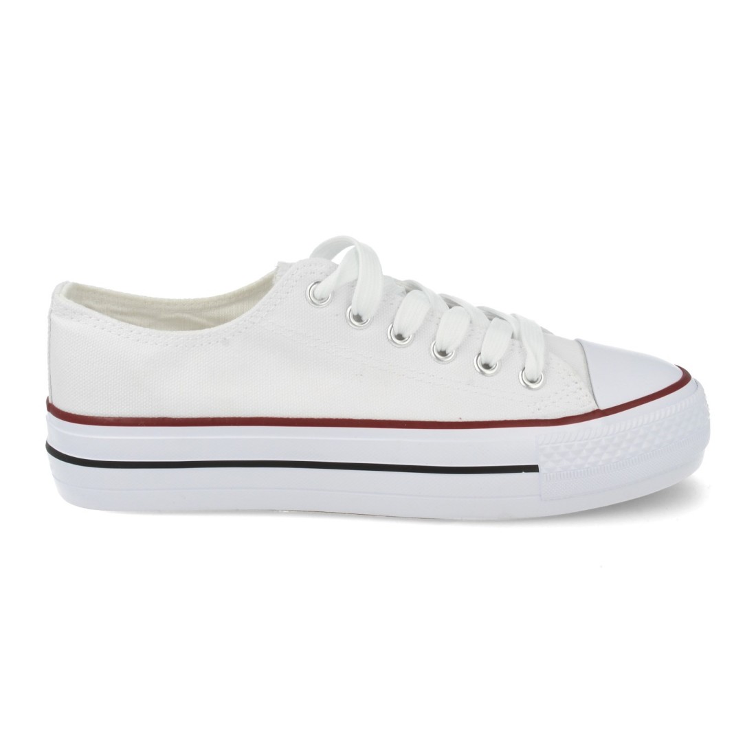 Zapatilla plana clásica, de punta redonda con cordones. Ribete rojo en la suela.