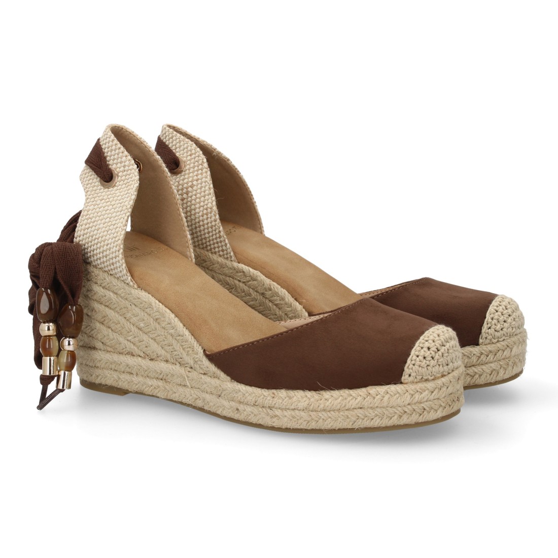 Sandalia valenciana de cuña para mujer estilo alpargata, punta cerrada, talón abierto, diseño artesanal con cierre de cuerdas con abalorios. Suala acolchada ideal Primavera verano.