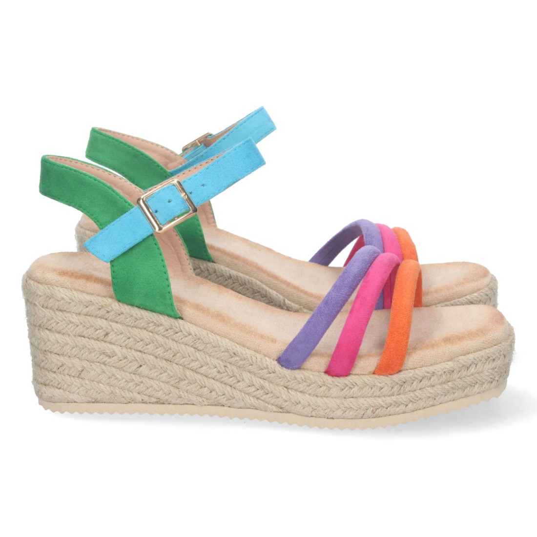 Sandalia de Cuña para Mujer, Comoda, Forrada de Yute, con Palas Multicolor, y Cierre de Hebilla, Primavera Verano 2023