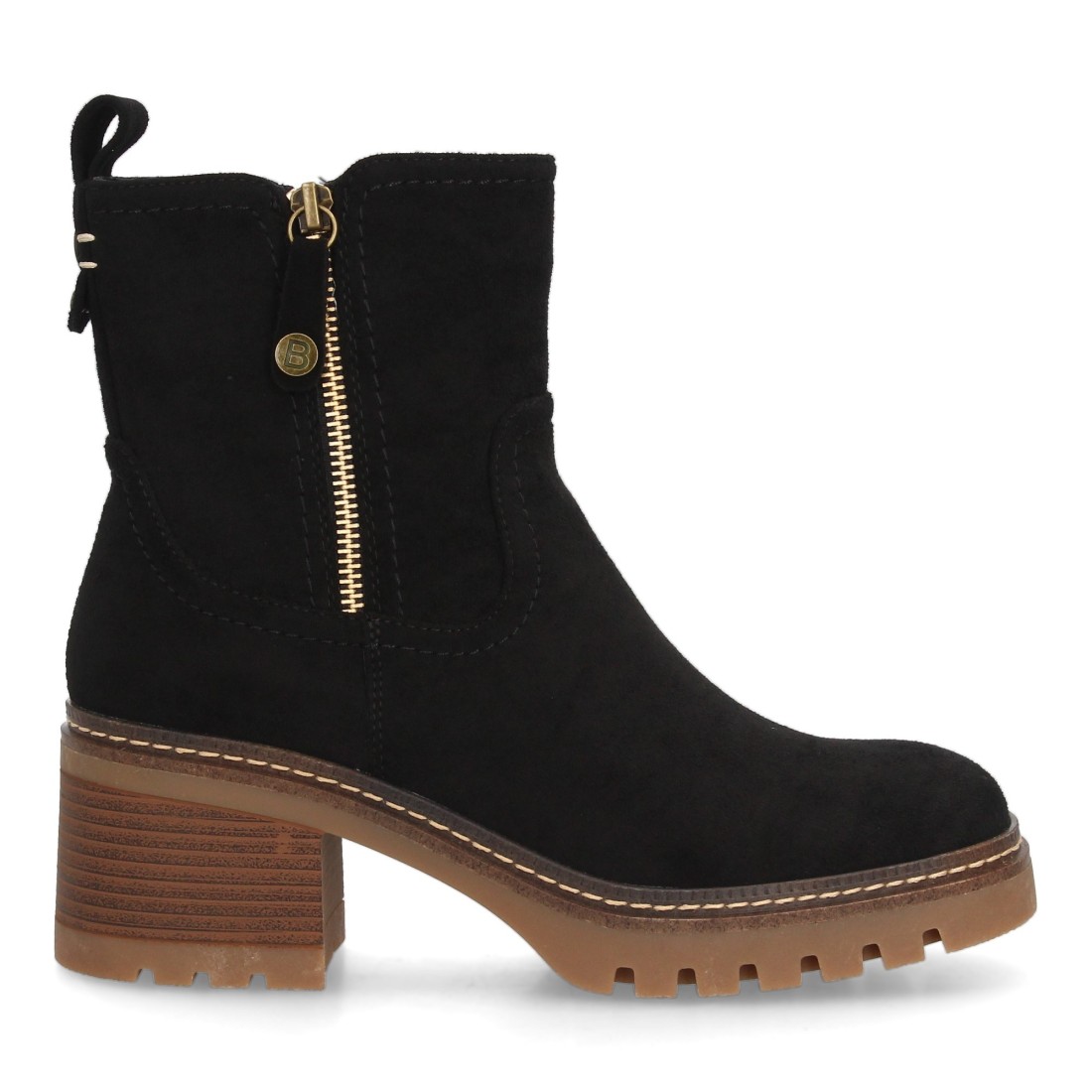 Botín con tacón para mujer con estampado liso, cuenta con cremallera lateral que facilita el calce y una suela dentada para los días de Otoño invierno. Tacón ancho cómodo.