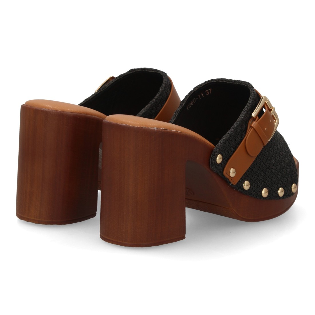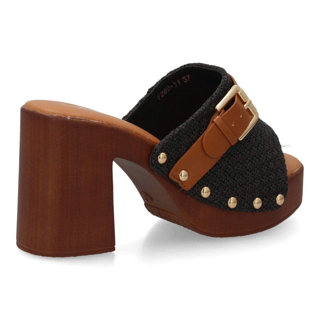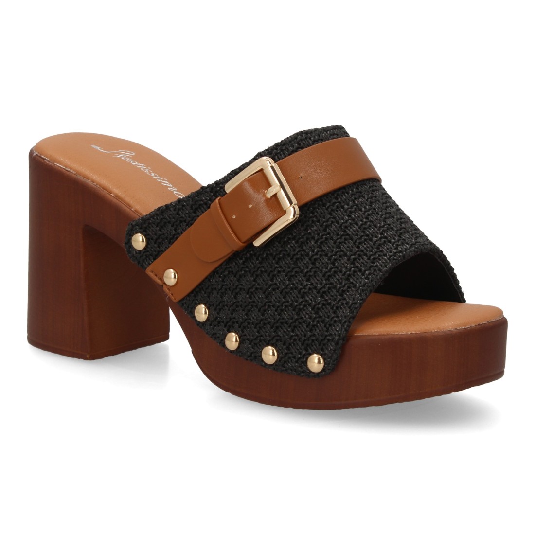 Sandalia tipo pala de mujer con tacón ancho simulando madera, pala con textura trenzada y hebilla, diseño de tachuelas metálicas. Un modelo cómodo y ligero para primavera verano.