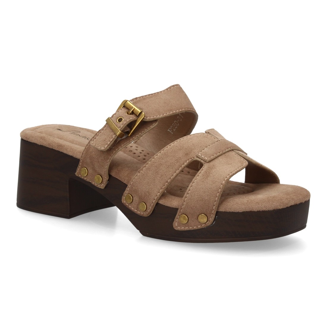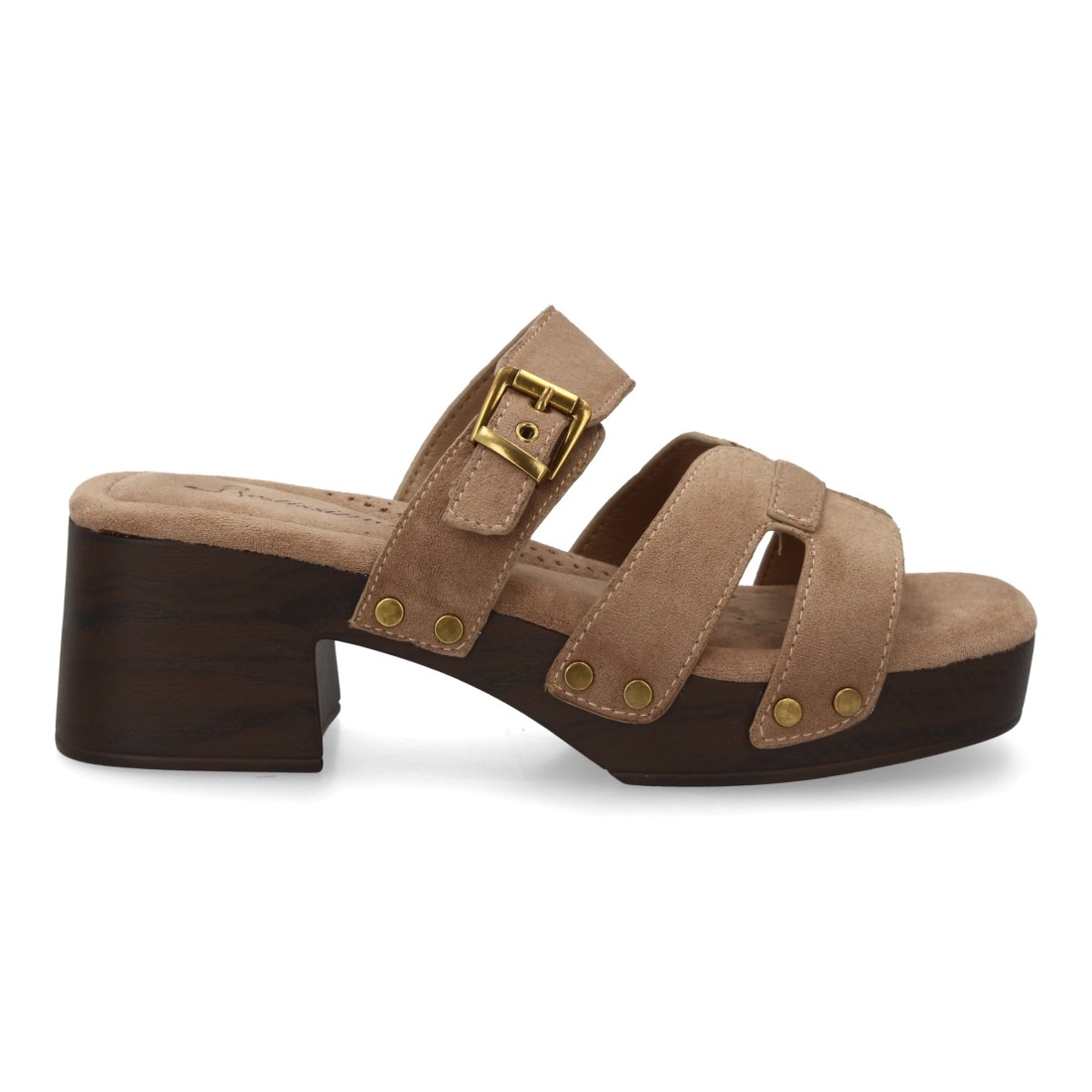 Sandalia para mujer con tachuelas y suela estilo madera, diseño de varias tiras en el empeine, cierre de hebilla. Un modelo cómodo y ligero para primavera verano.
