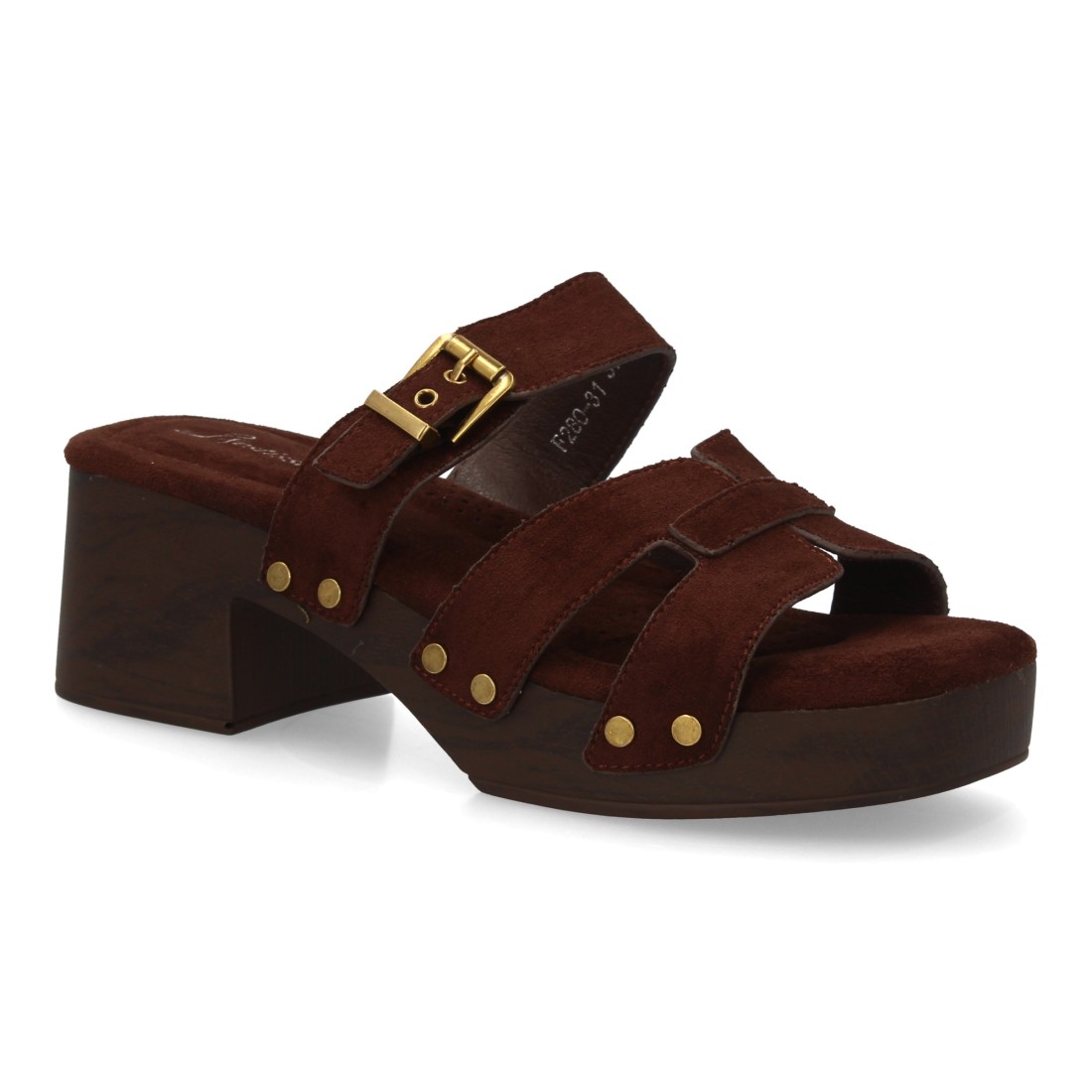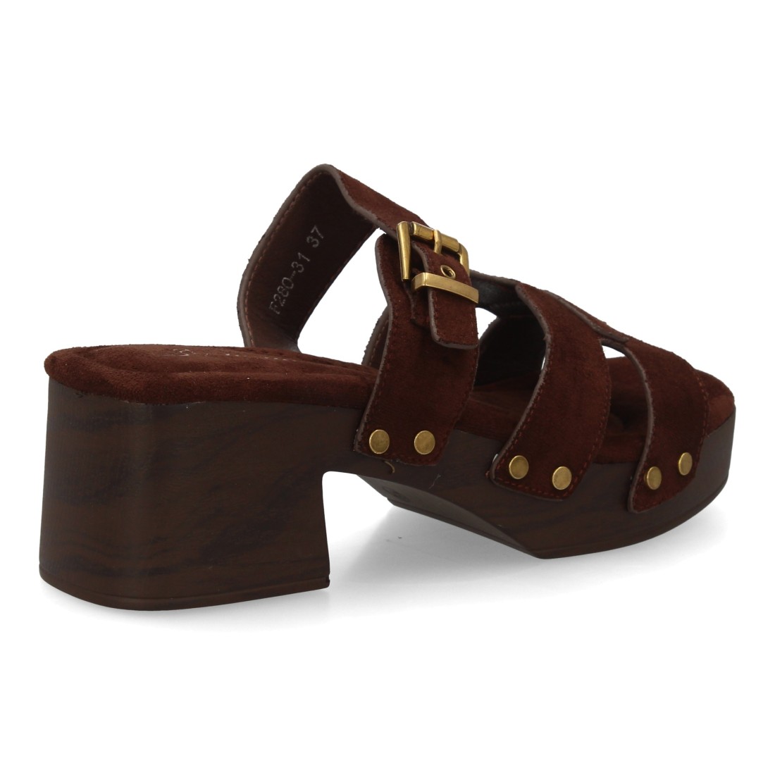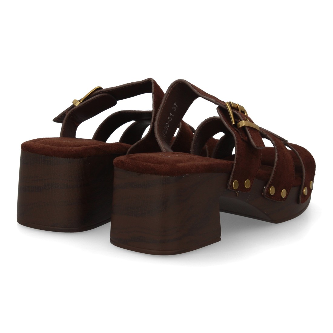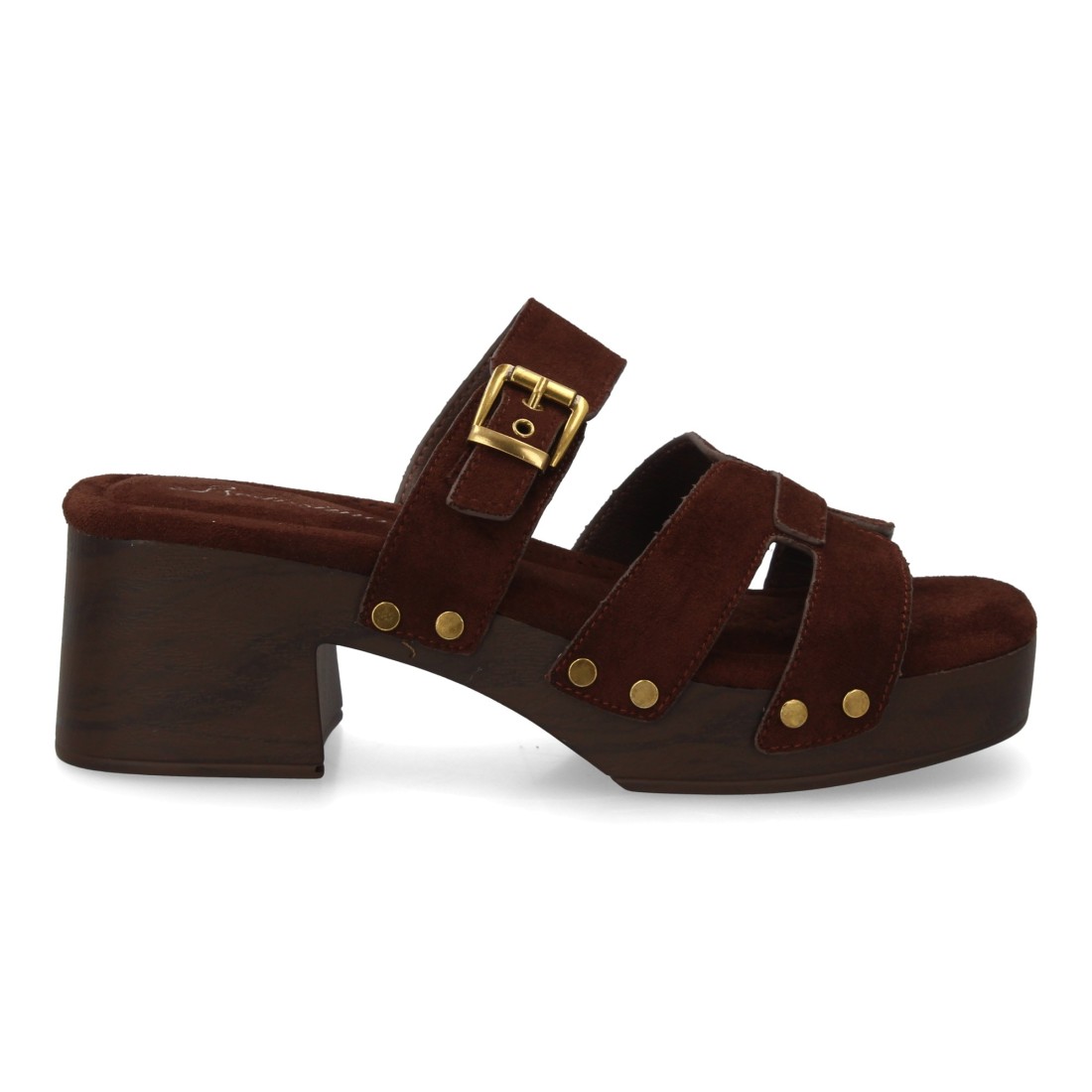 Sandalia para mujer con tachuelas y suela estilo madera, diseño de varias tiras en el empeine, cierre de hebilla. Un modelo cómodo y ligero para primavera verano.