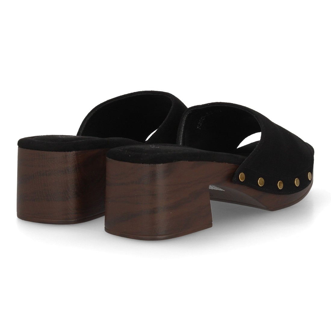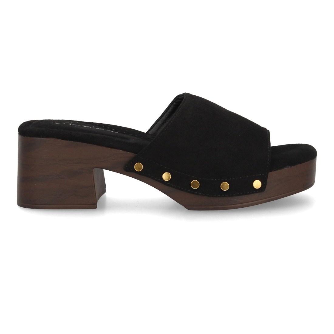Sandalia tipo zueco de mujer con tacón ancho. Suela cómoda y ligera estilo madera. Pala ancha estampado liso, decorado con tachuelas. Ideal primavera verano.