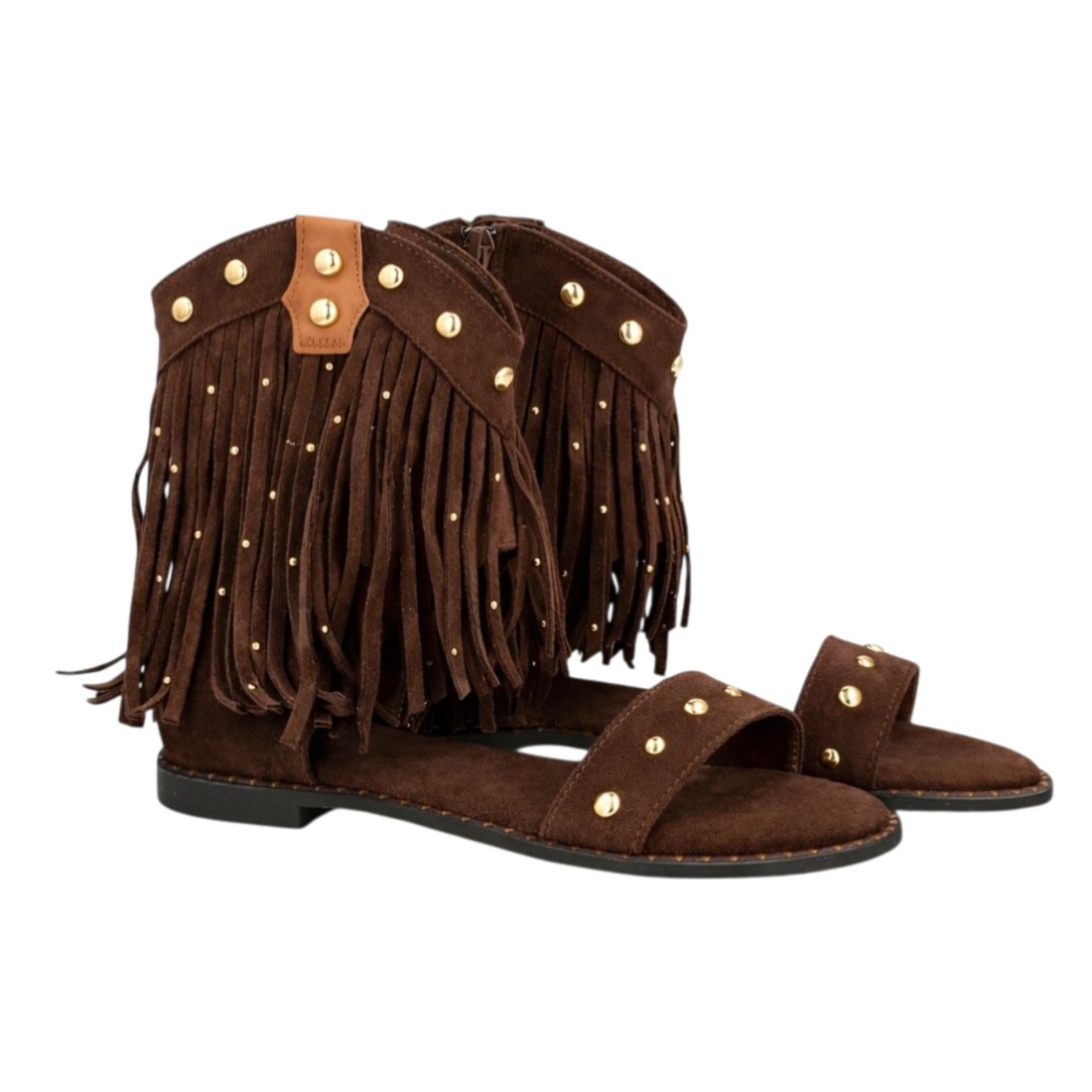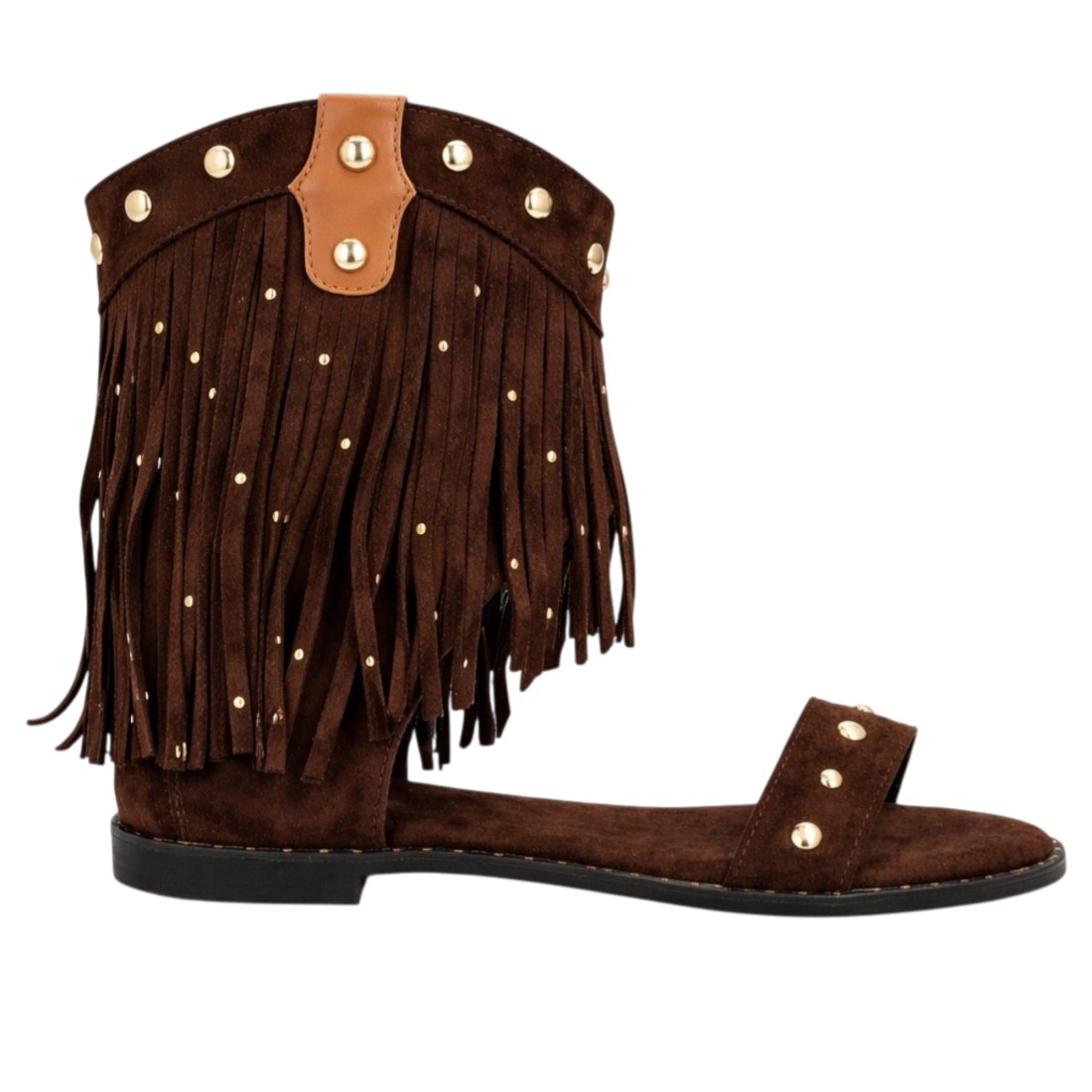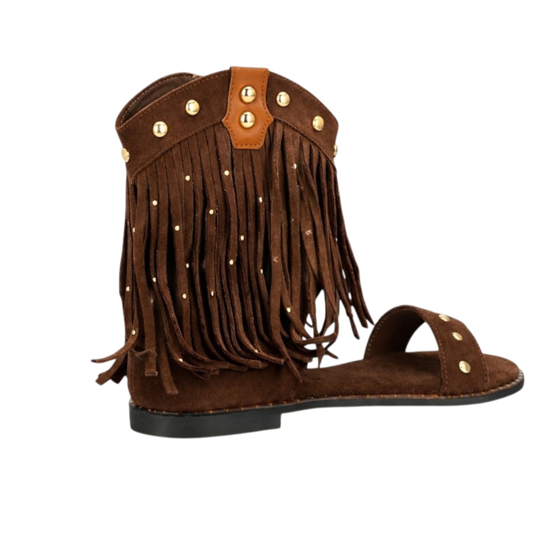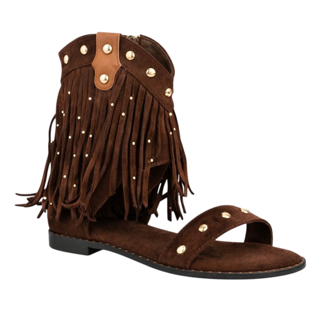 Sandalia plana estilo boho para mujer con diseño de flecos y detalles metálicos, estructura tipo botín abierto, tachuelas decorativas, suela acolchada ideal uso diario.