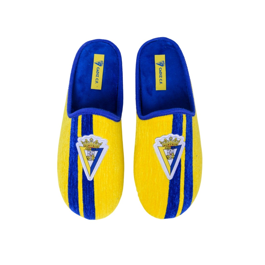 Zapatillas de estar por casa del FC Cádiz con diseño clásico con el escudo oficial del club, fabricadas en España con materiales resistentes. Suela antideslizante, lavables