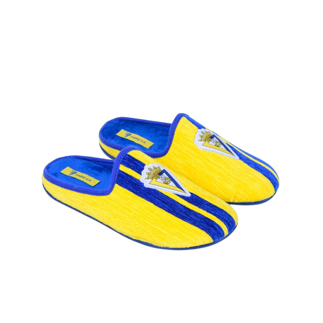 Zapatillas de estar por casa del FC Cádiz con diseño clásico con el escudo oficial del club, fabricadas en España con materiales resistentes. Suela antideslizante, lavables