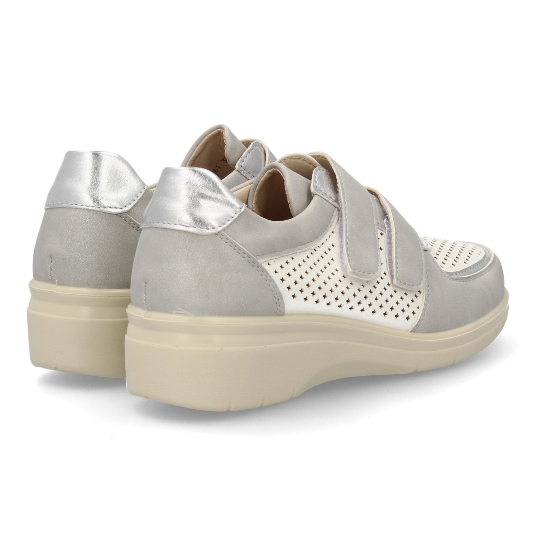 Zapatillas confort para mujer, ofrecen bienestar en el día a día. Corte troquelado que favorece la transpiración, cierre autoadherente. Detalles metalizados, suela ligera con cuña.
