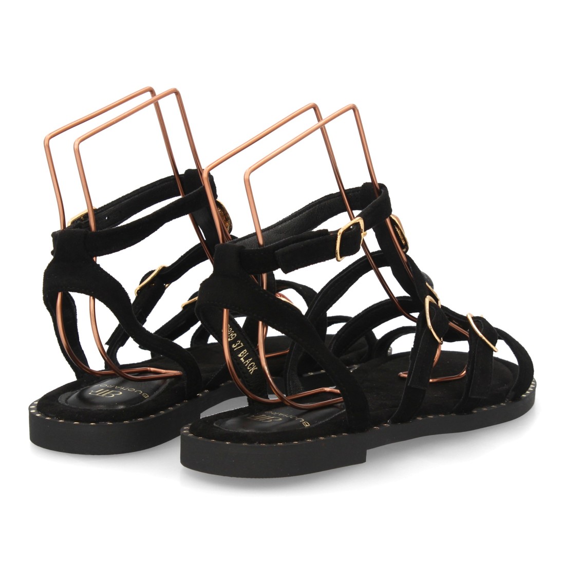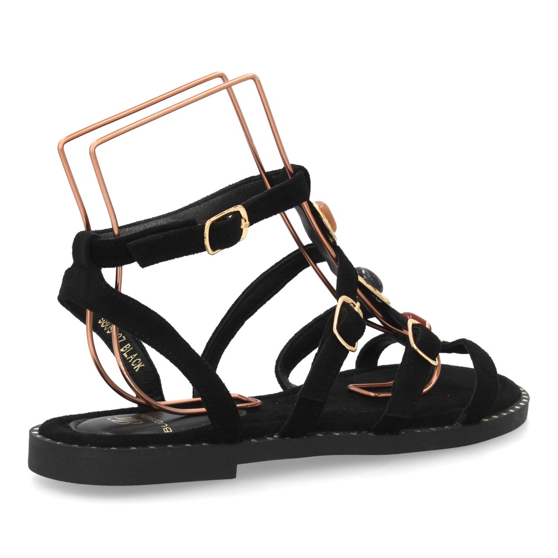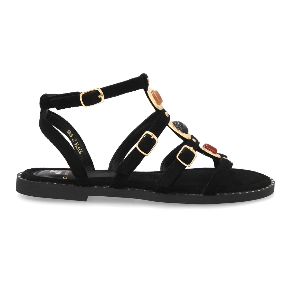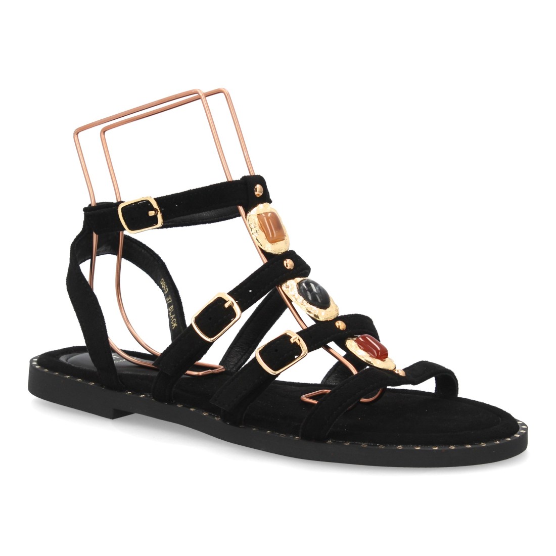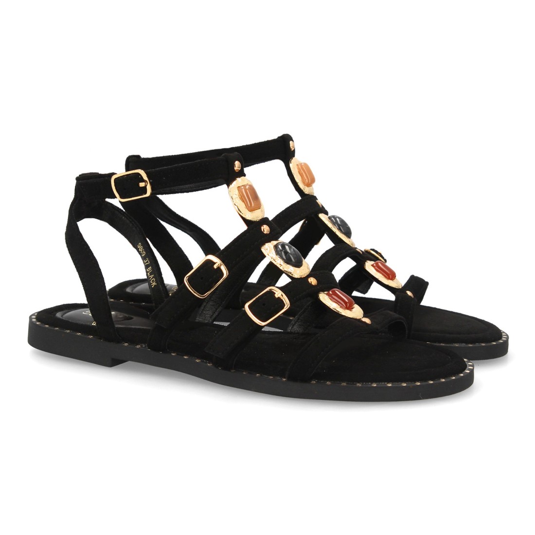 Sandalia plana mujer con estilo romano, diseño de tiras cruzadas y adorno de pedreria y hebillas. Cierre de hebilla en el tobillo. Suela cómoda y ligera. Ideal para verano.