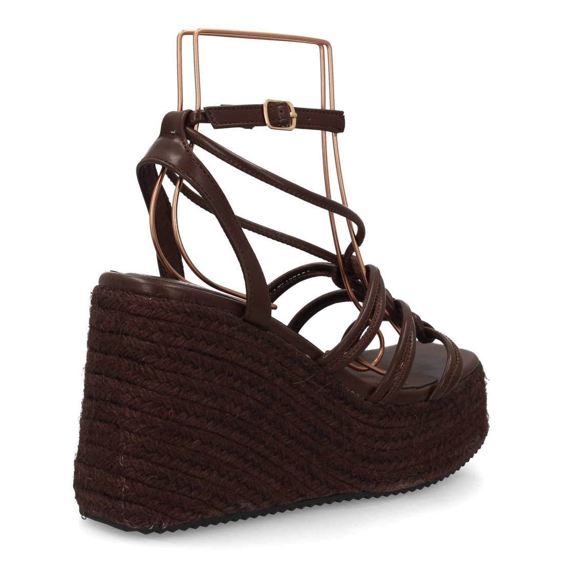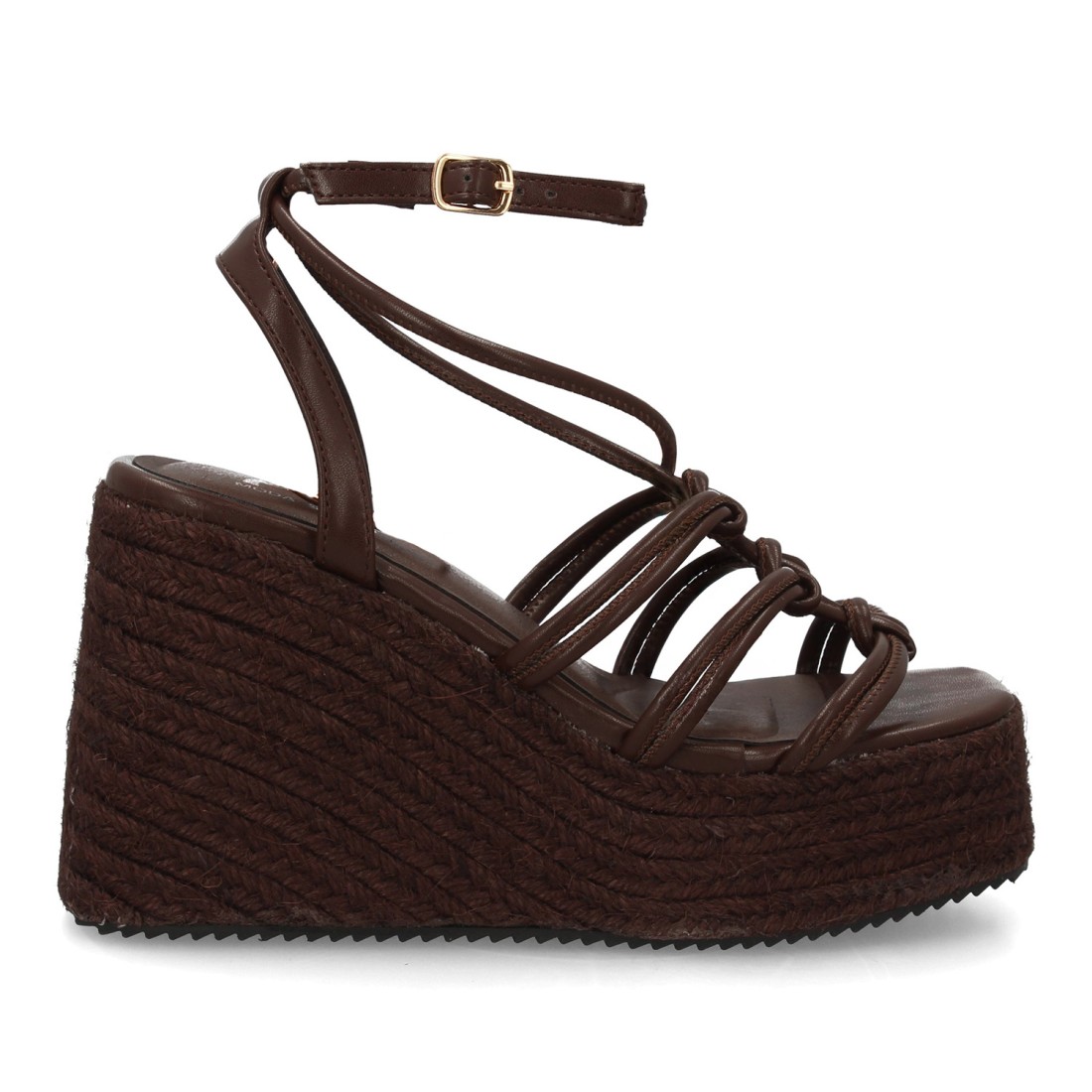Sandalia de mujer con cuña alta y plataforma de esparto, diseño de tiras múltiples con detalles anudados, de nudos, pulsera al tobillo con cierre de hebilla, ideal primavera verano