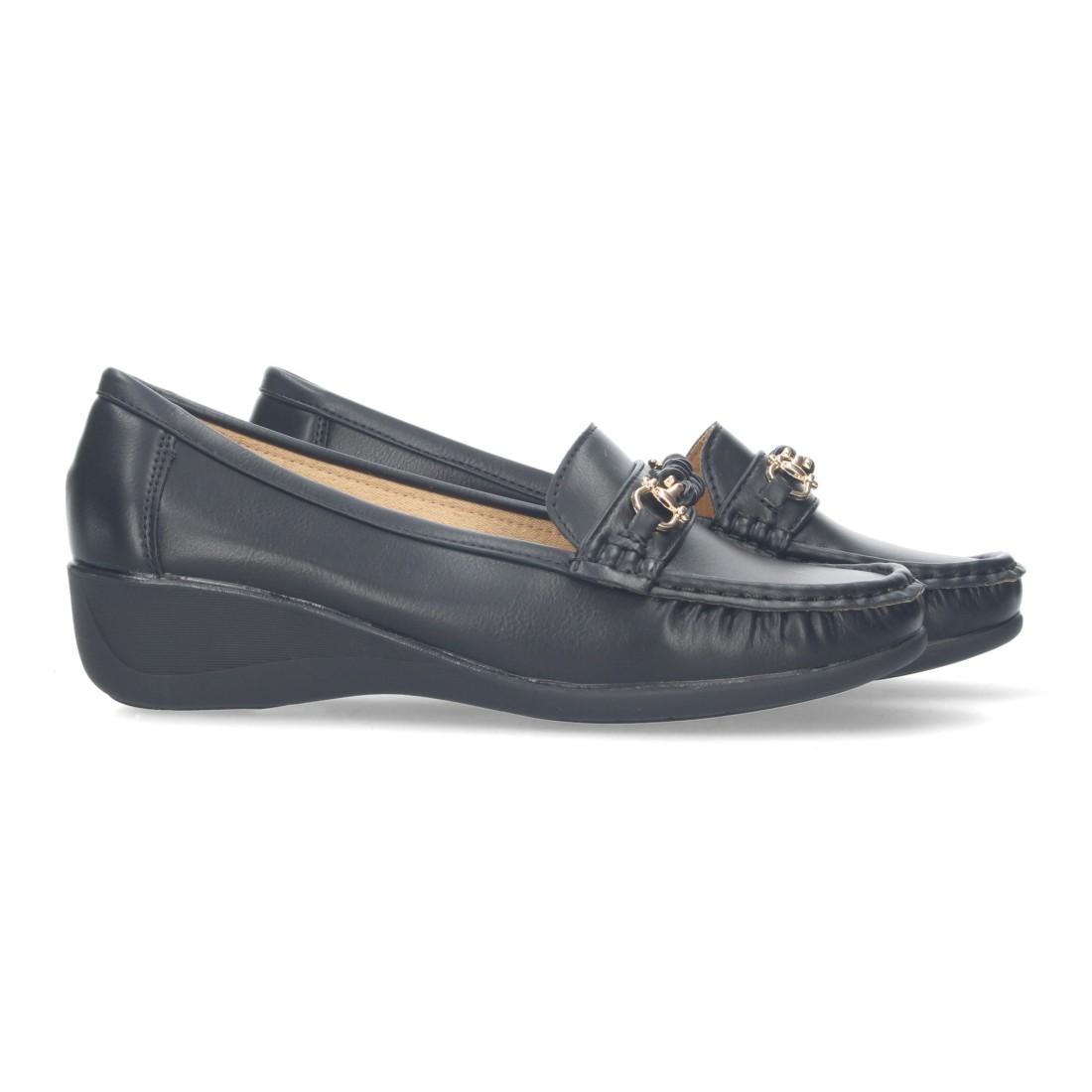 Mocasin con cuña de mujer, con detalle metalico en la pala.