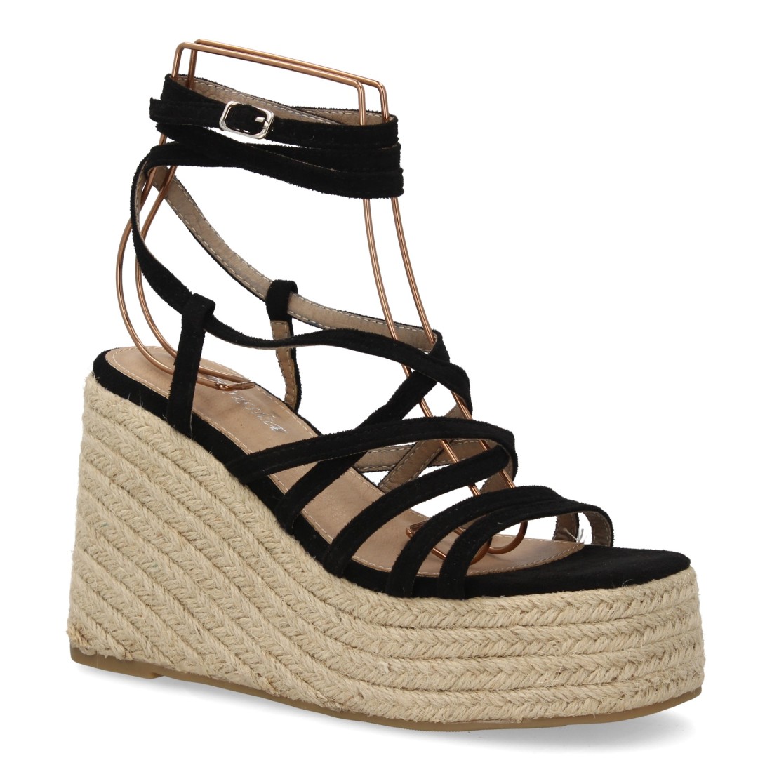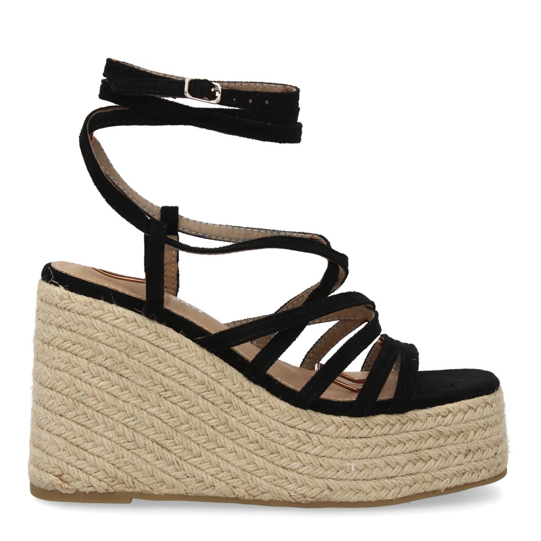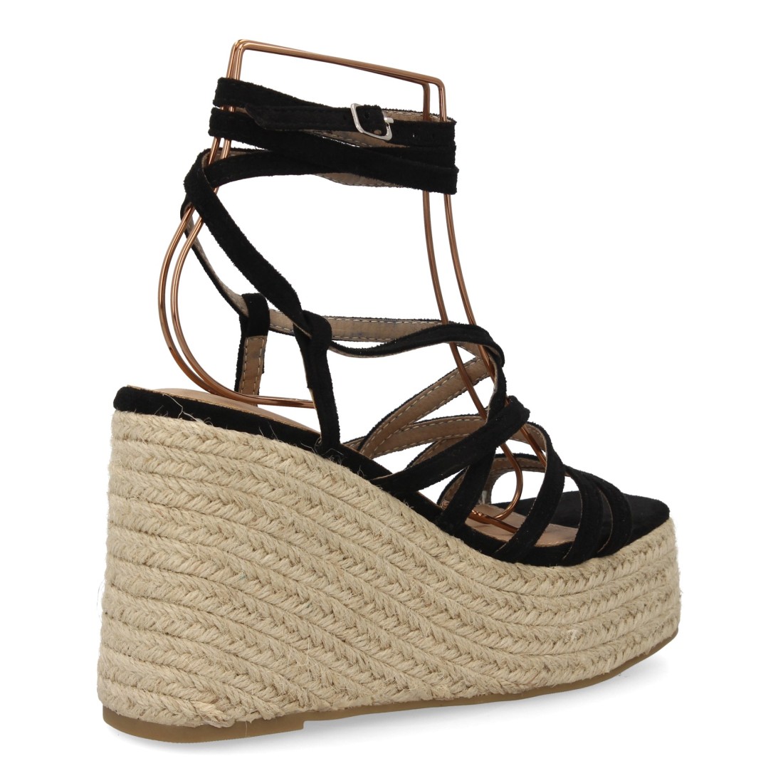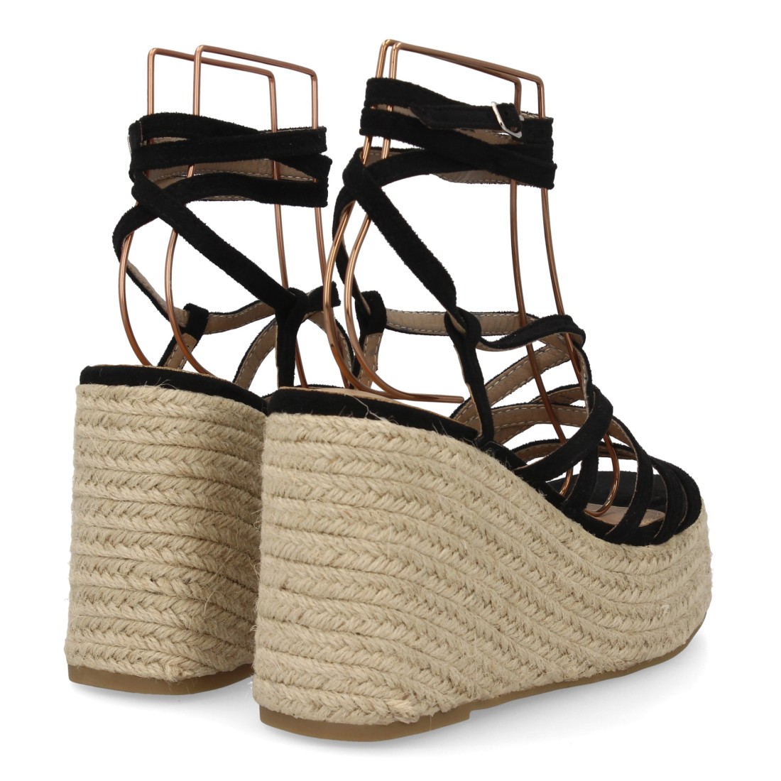 Sandalias de cuña alta estilo romano con plataforma de yute trenzado. Cierre de cuerdas. Diseño de tiras finas envuelve el pie y se ajusta al tobillo. Ideal primavera verano.