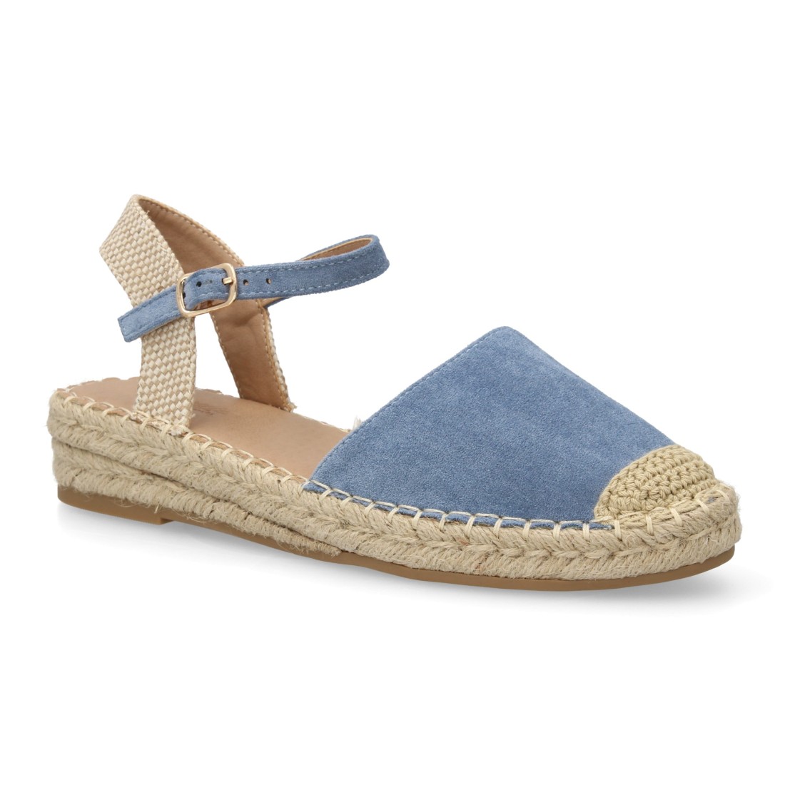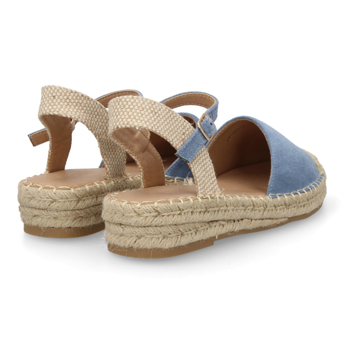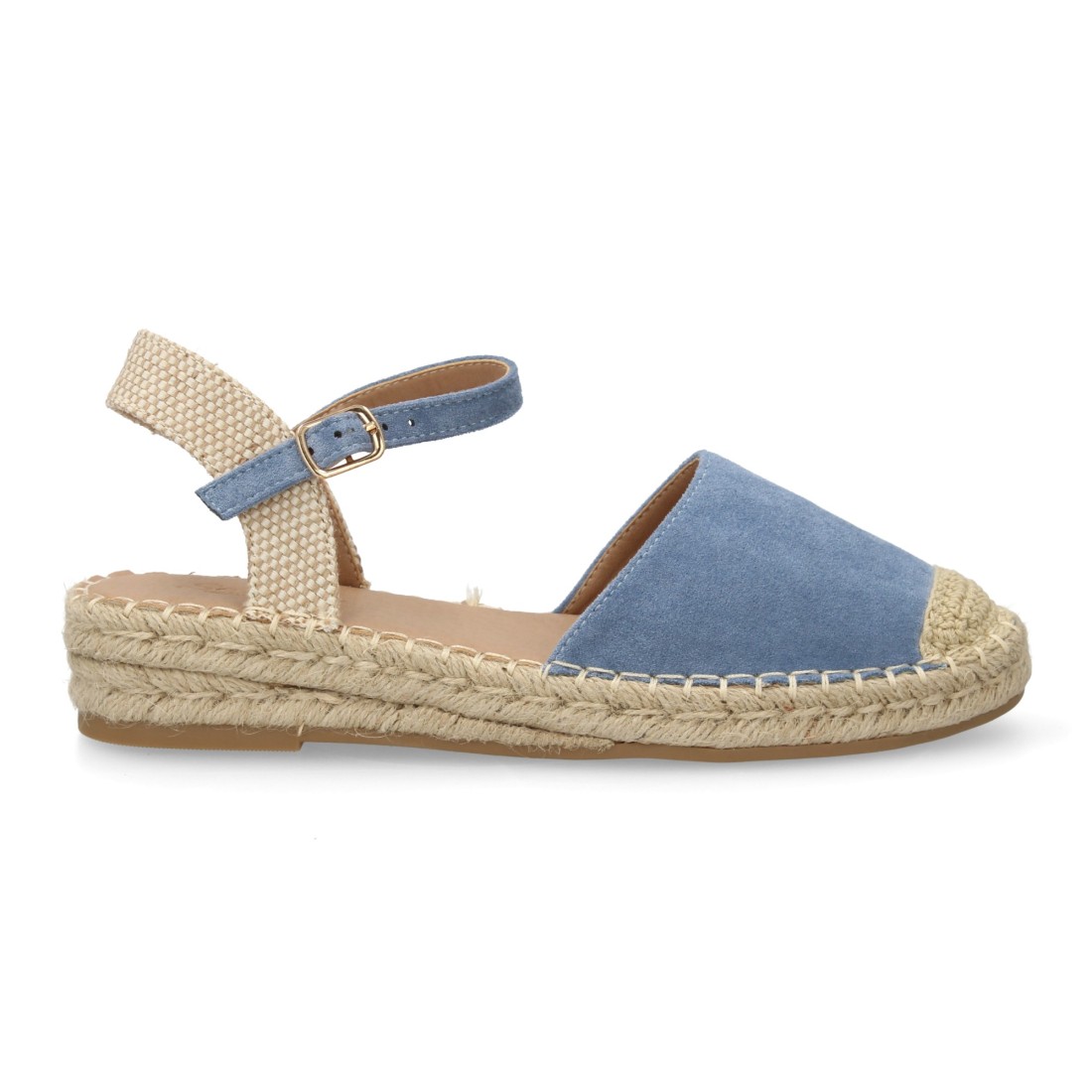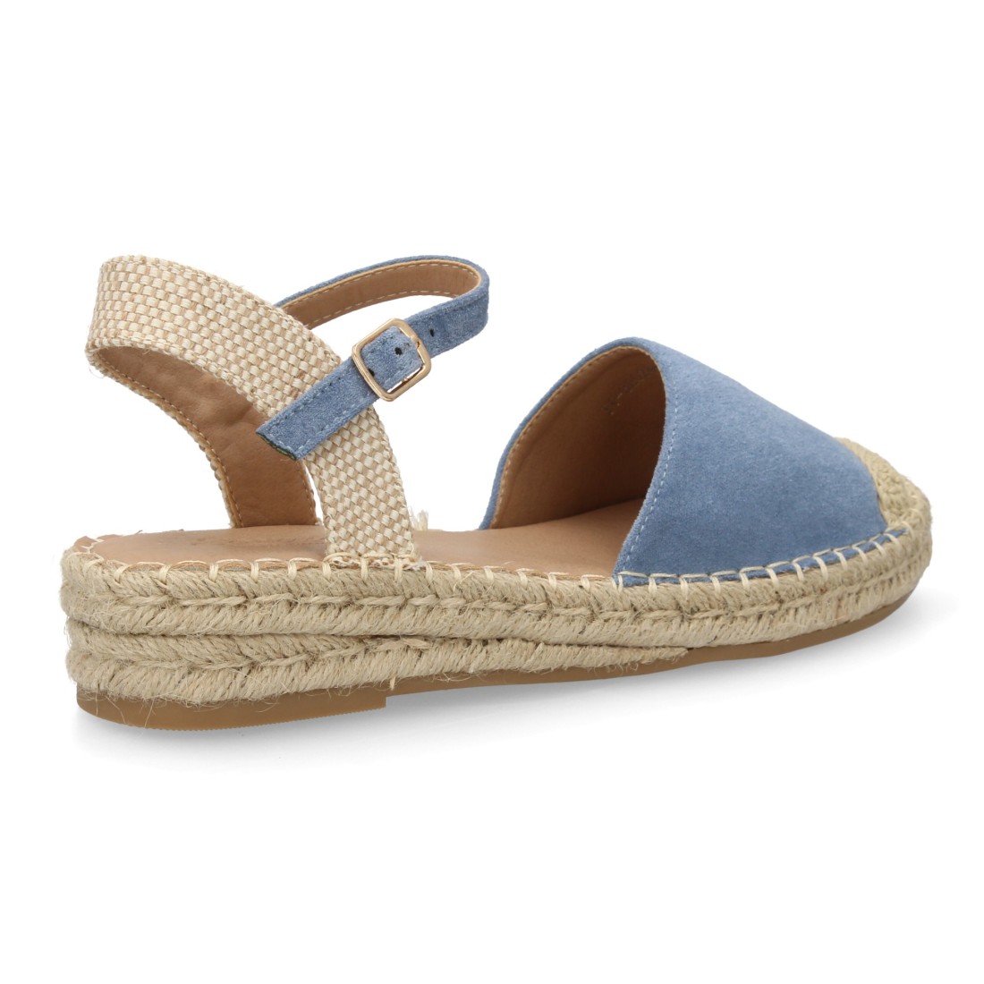 Sandalia Alpargata de mujer con diseño abierto, cuña ligera de yute, esparto. Estampado liso. Cierre de hebilla y punta cerrada. Ideal temporada primavera verano.