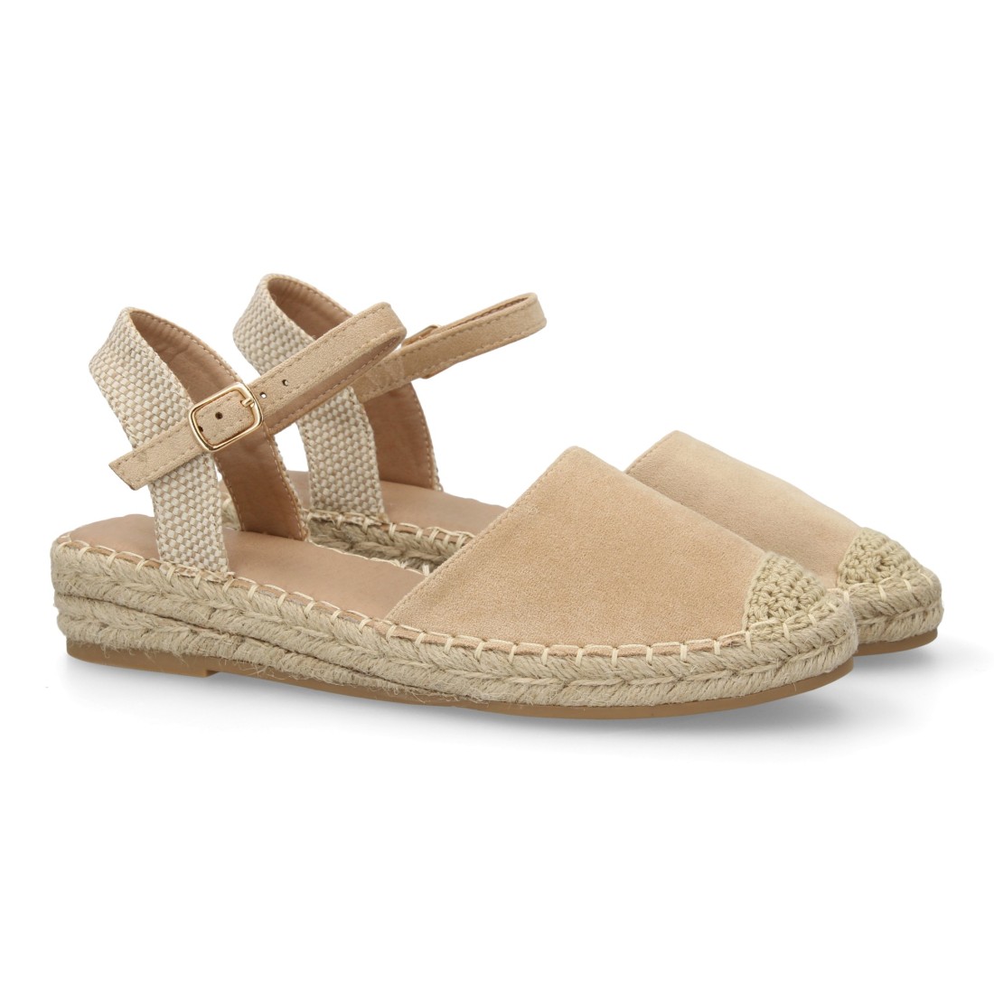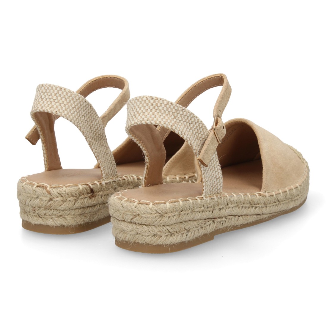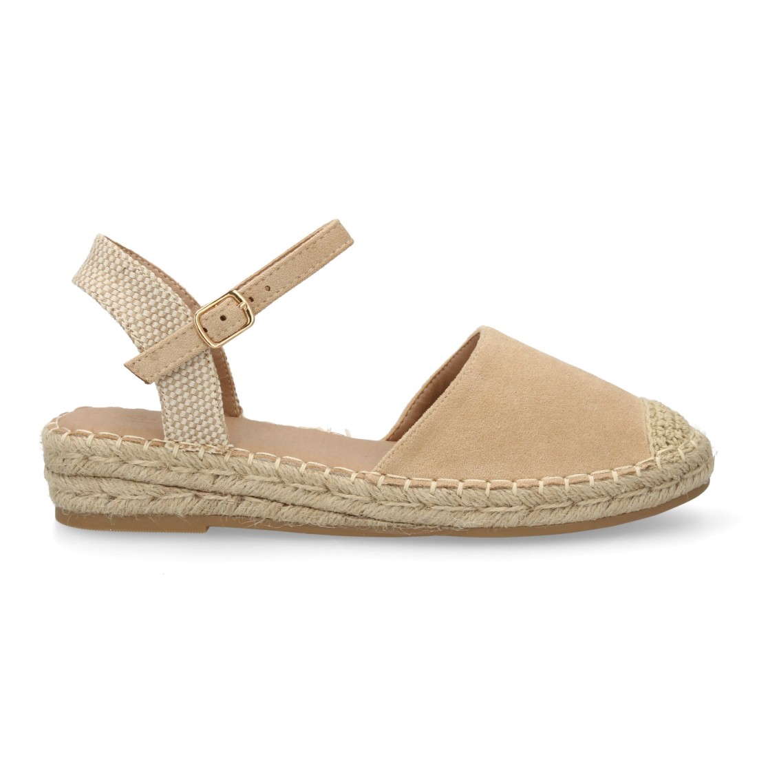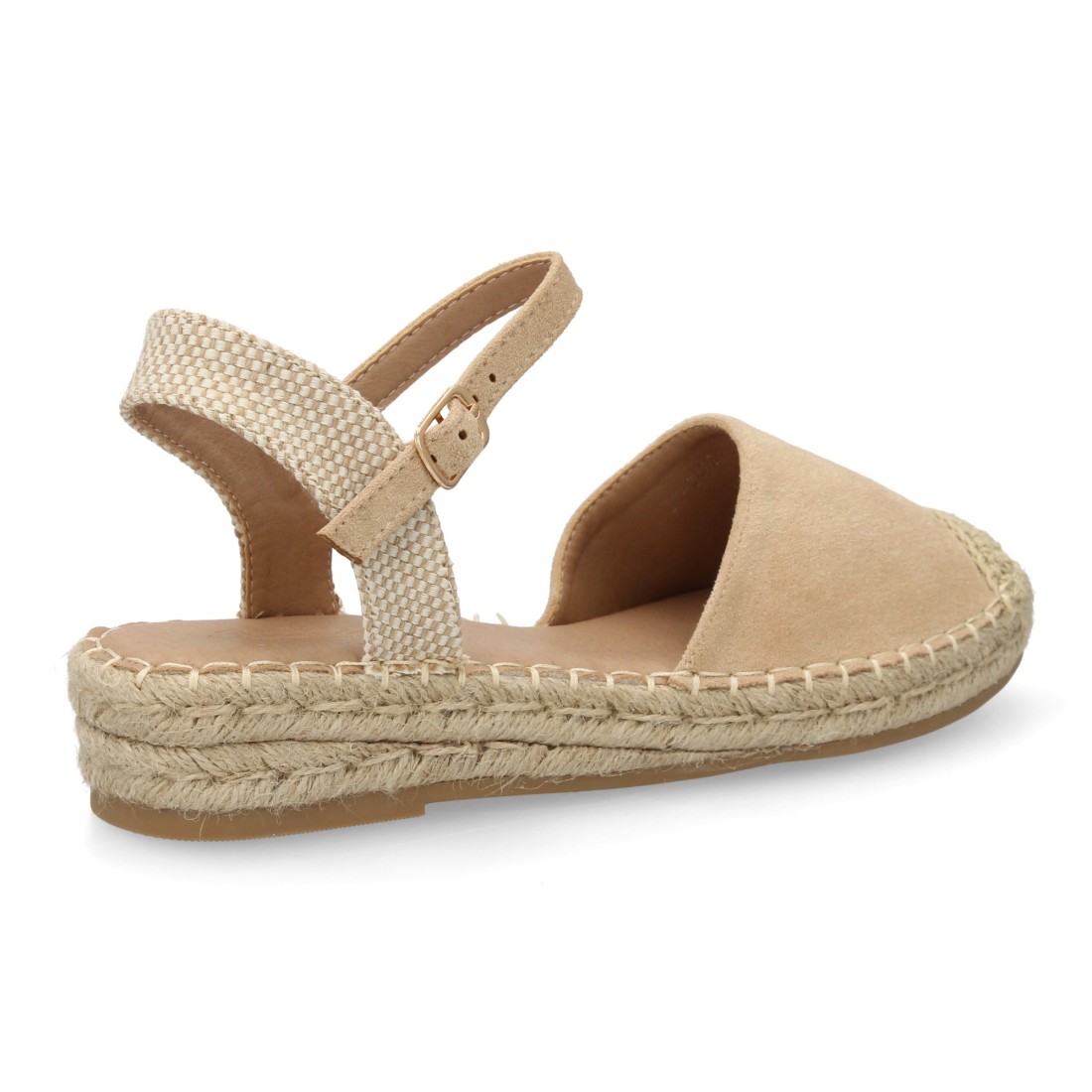 Sandalia Alpargata de mujer con diseño abierto, cuña ligera de yute, esparto. Estampado liso. Cierre de hebilla y punta cerrada. Ideal temporada primavera verano.