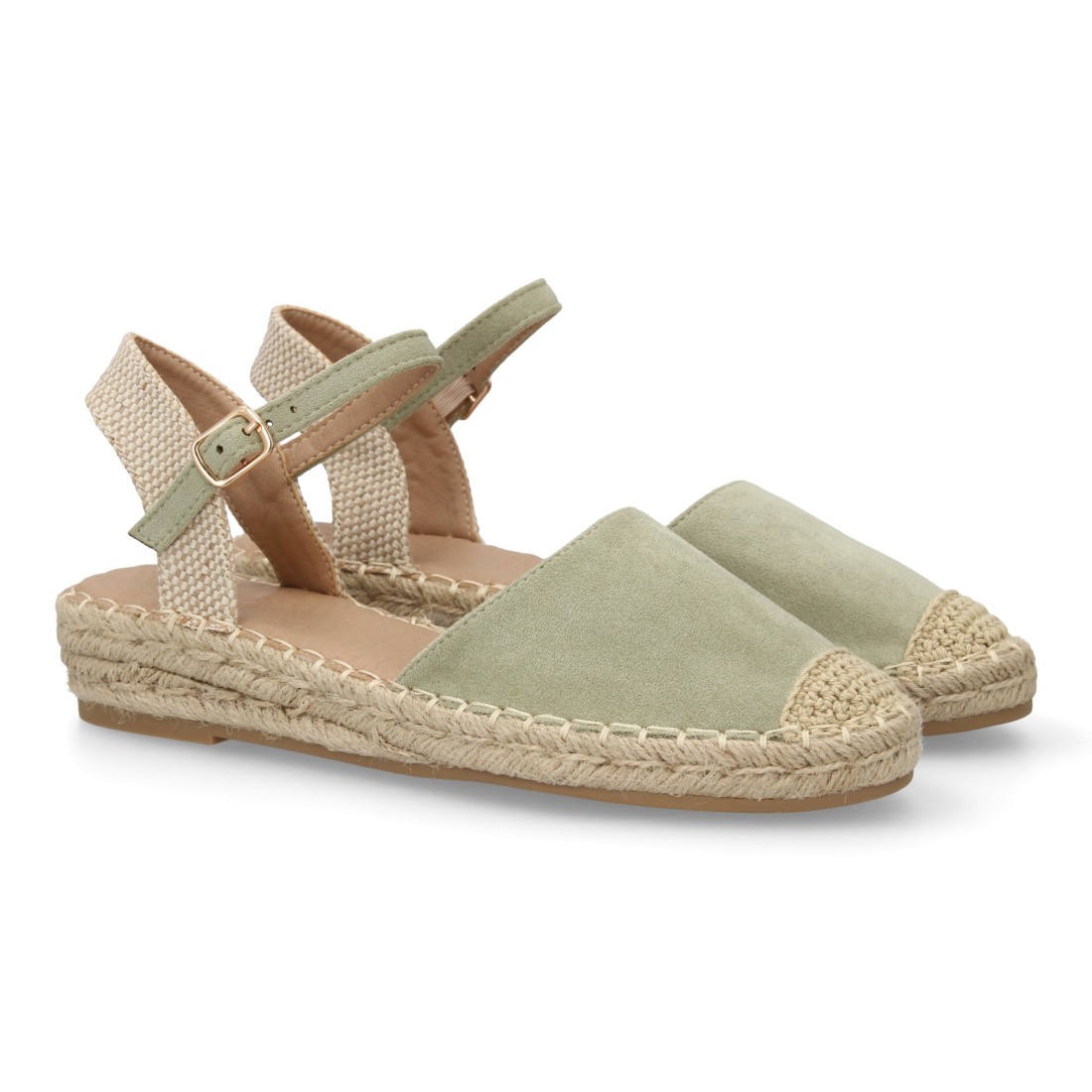 Sandalia Alpargata de mujer con diseño abierto, cuña ligera de yute, esparto. Estampado liso. Cierre de hebilla y punta cerrada. Ideal temporada primavera verano.
