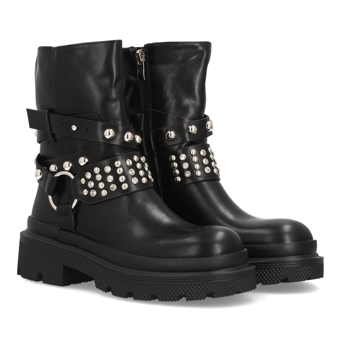 Botas para mujer con diseño de bandas cruzadas adornadas con tachuelas y remaches y aros metálicos con cierre de cremallera. Ideal Otoño Invierno.