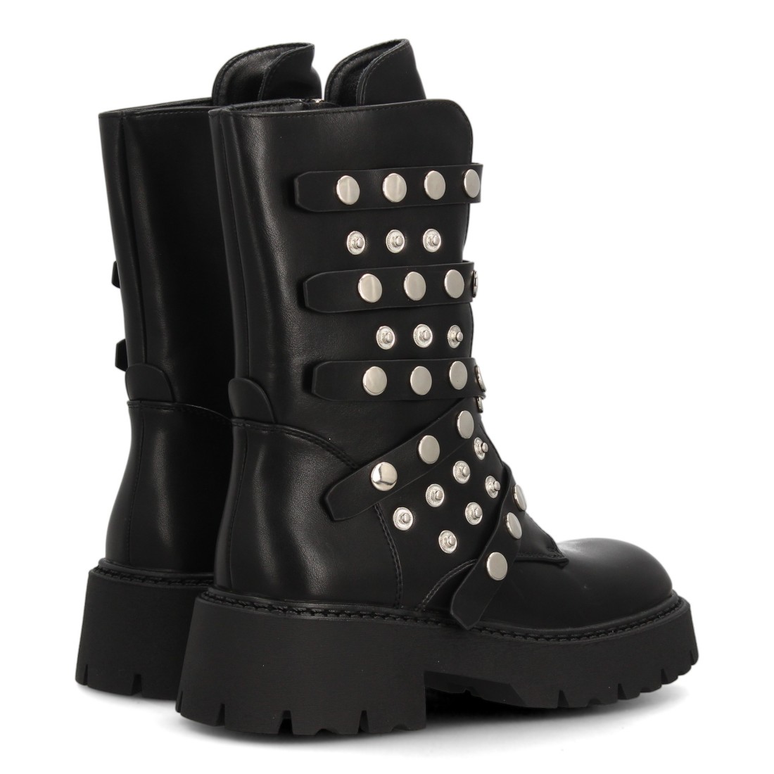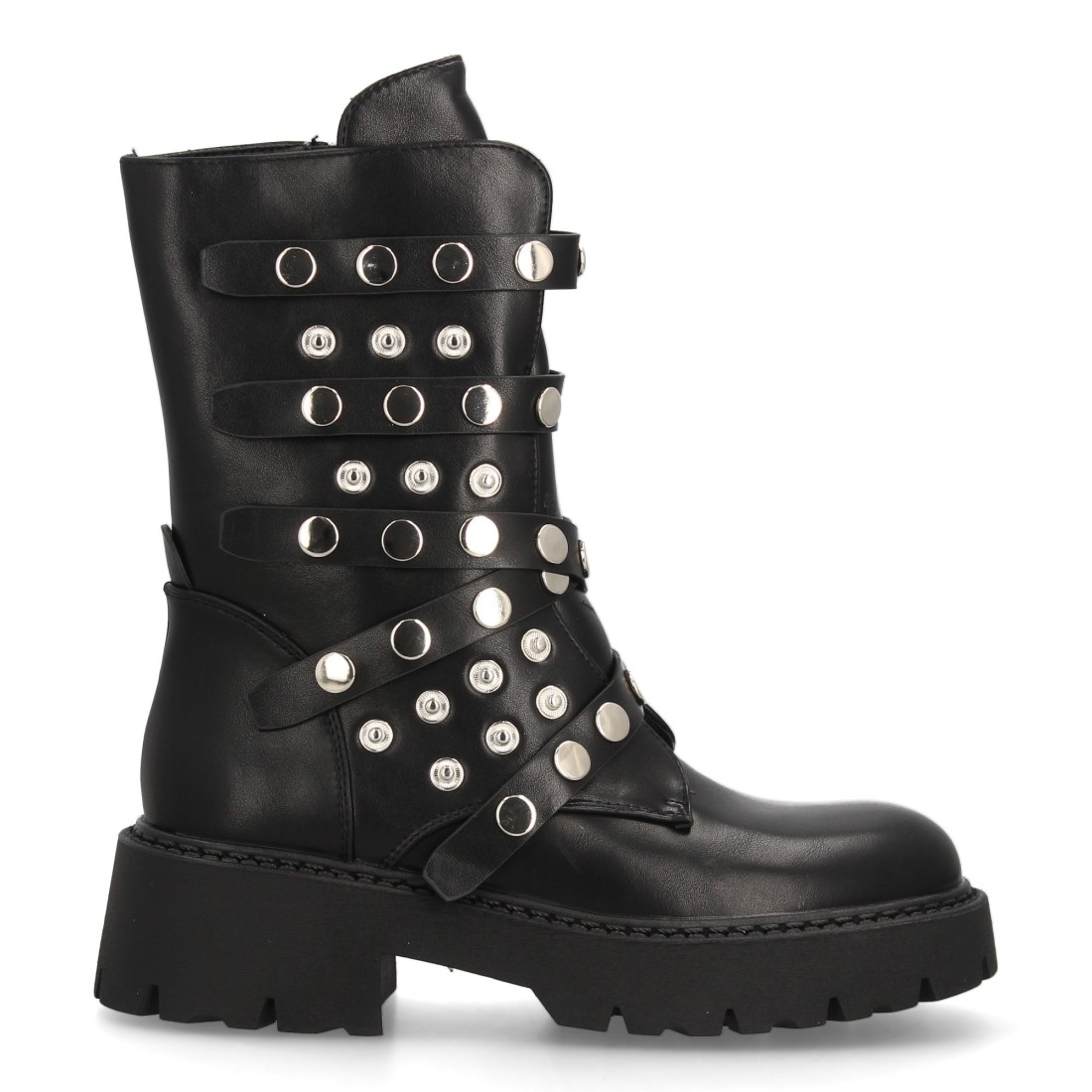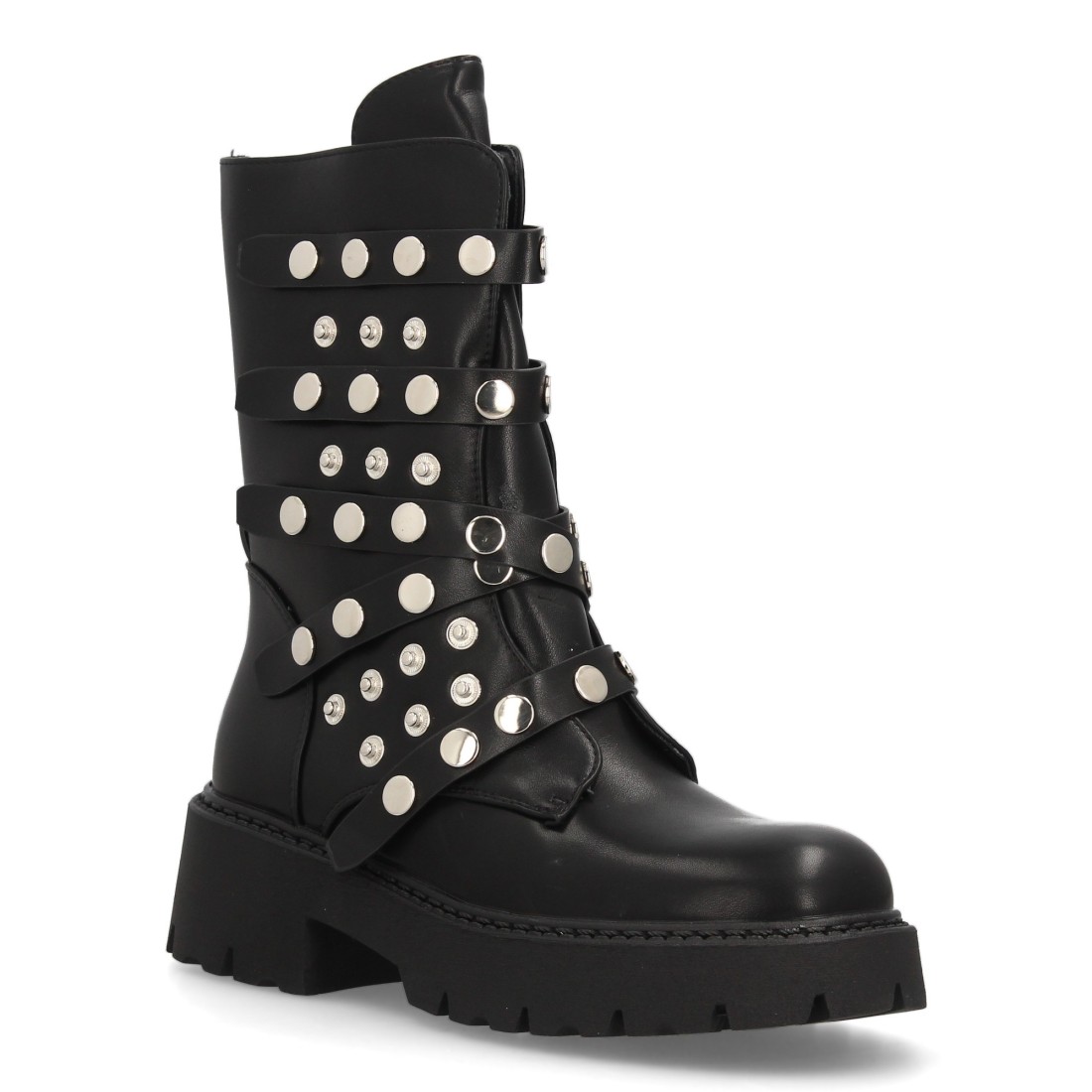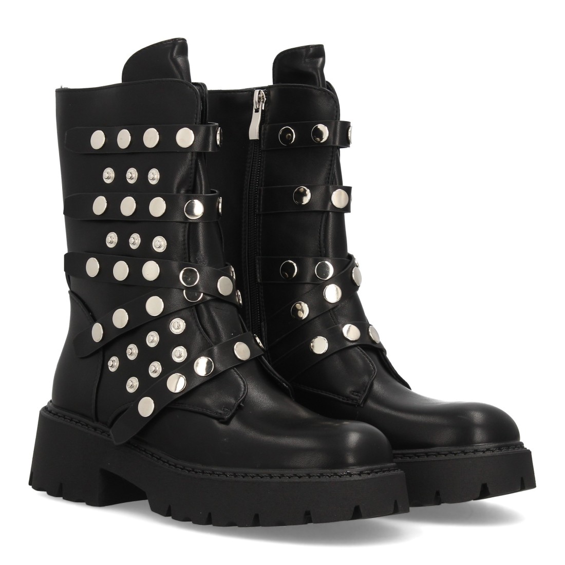 Botín de plataforma para mujer con múltiples tiras decorativas con tachuelas metálicas, suela gruesa de estilo track, cierre de cremallera. Ideal Otoño Invierno.