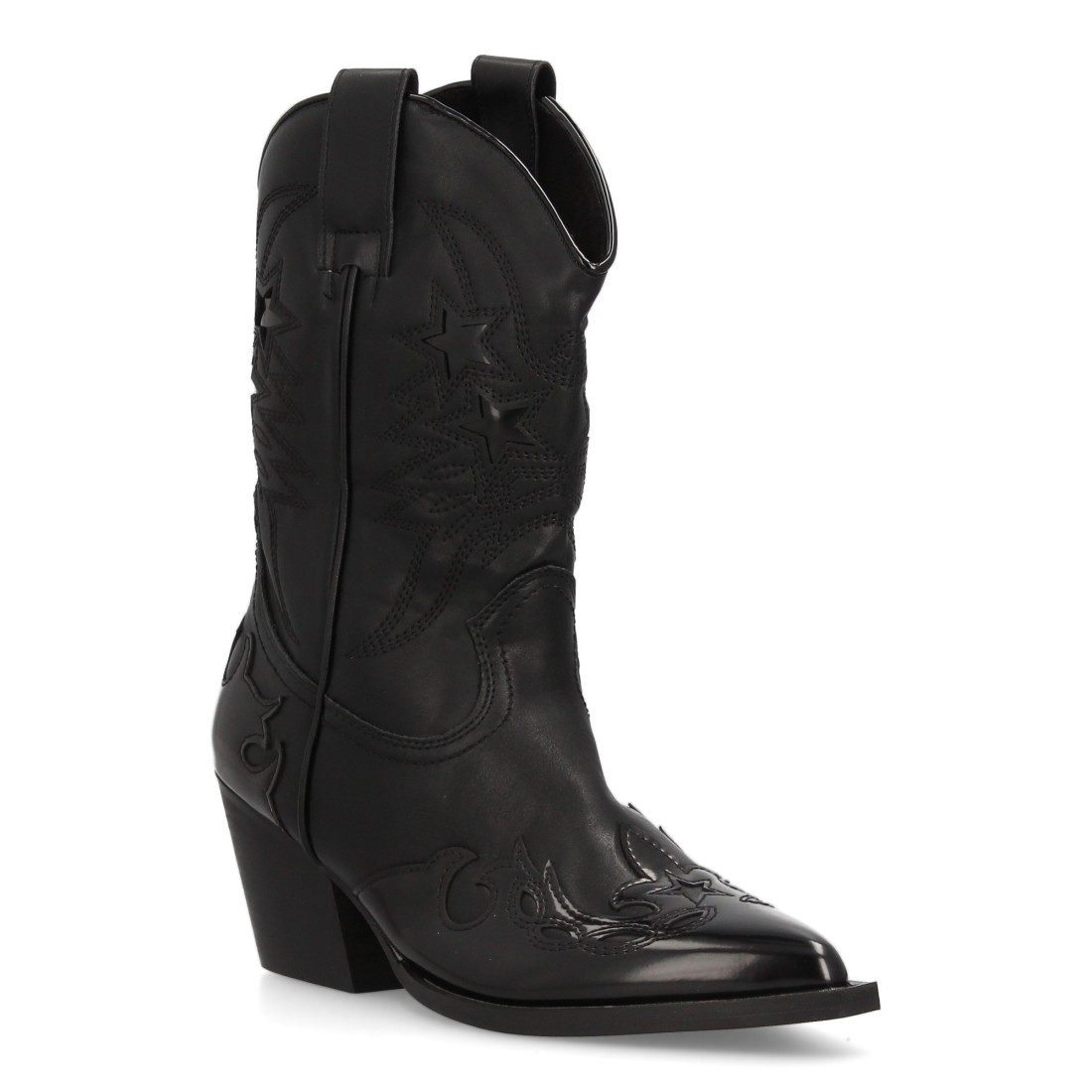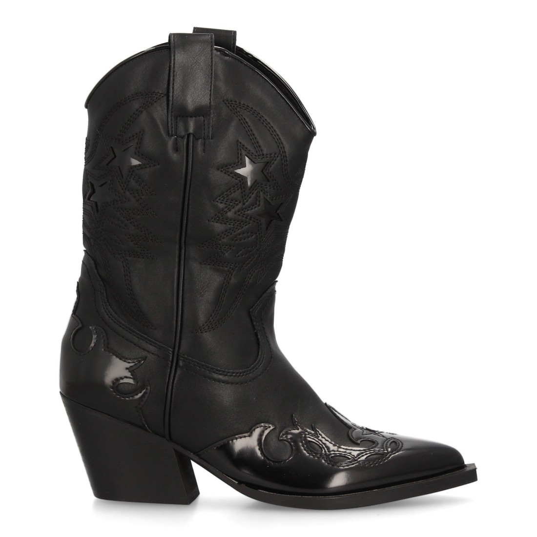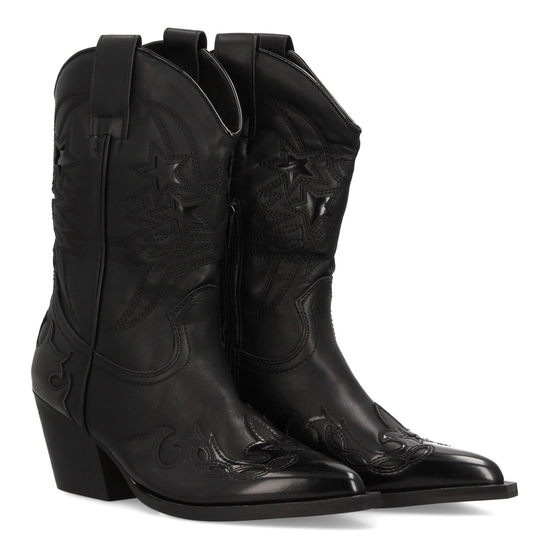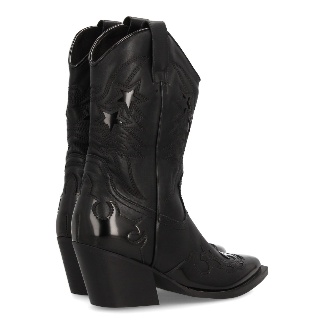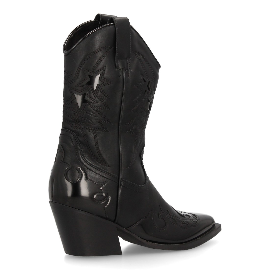 Bota cowboy para mujer con diseño de estrellas brillantes. Punta fina, tacón ancho medio. Cierre de cremallera. Ideal Otoño invierno.