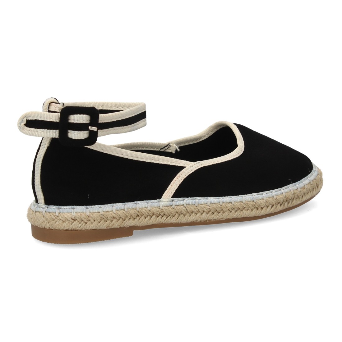 Alpargatas planas para mujer con cierre de hebilla en el tobillo, diseño cerrado en la puntera y en el talón, estilo bailarina. Material fresco y ligero, ideal primavera verano.