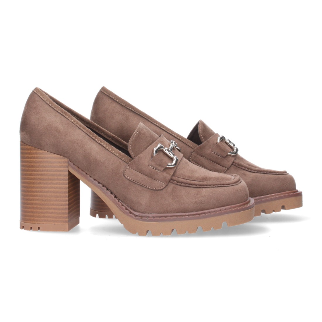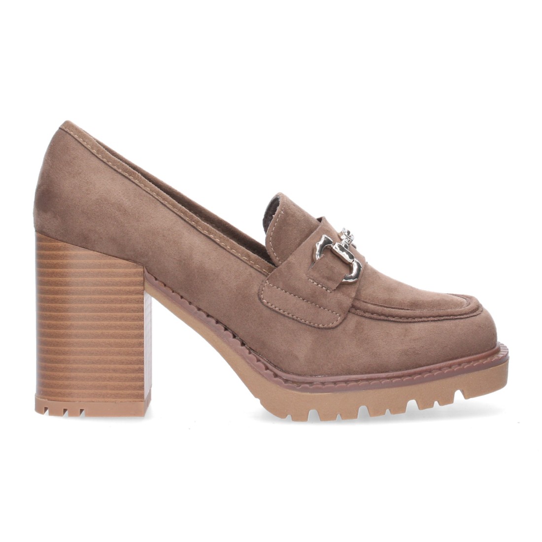 Mocasin de tacon para mujer, con adorno metalico en la pala y material aterciopelado.