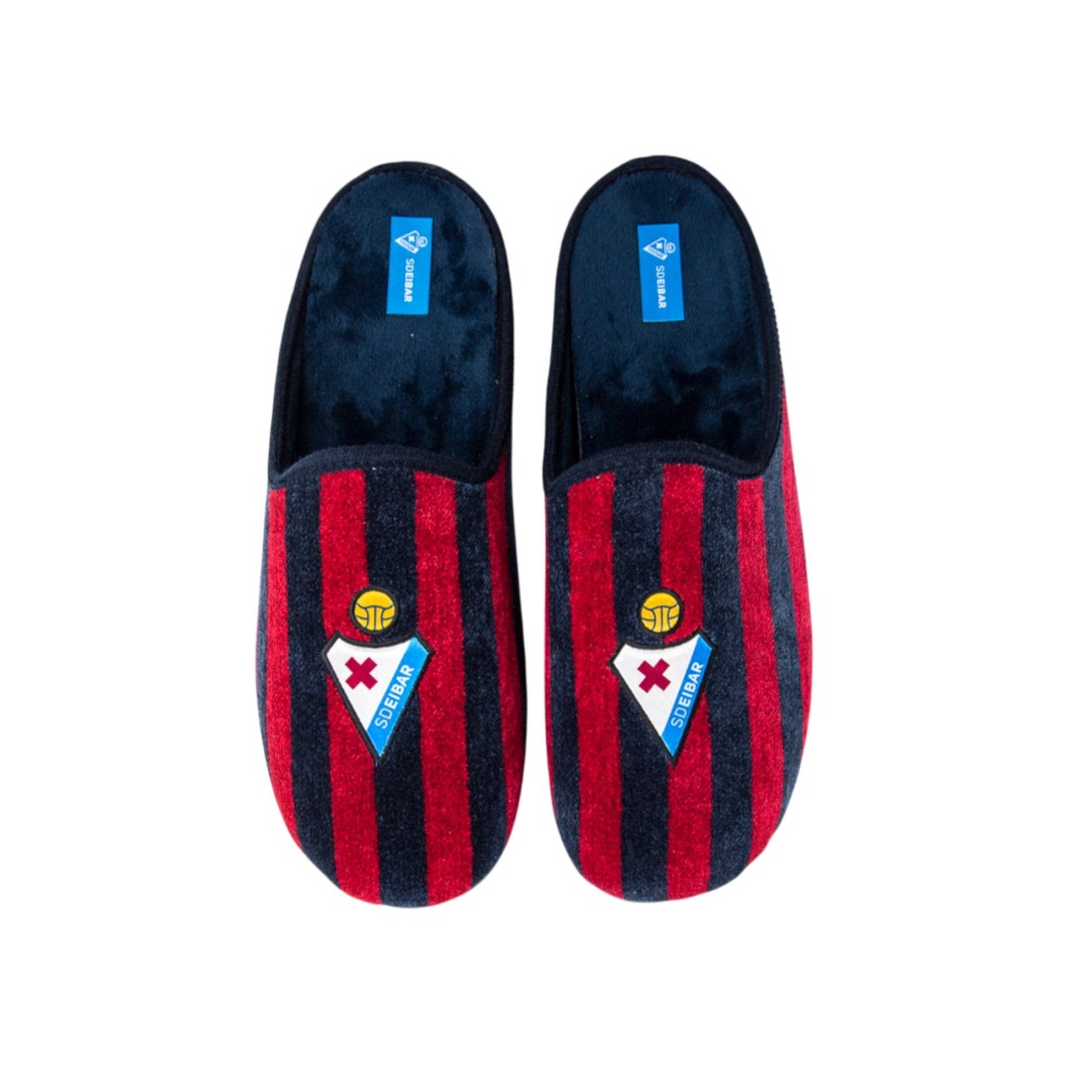 Zapatillas de estar por casa del SD Eibar con diseño clásico con el escudo oficial del club, fabricadas en España con materiales resistentes. Suela de caucho antideslizante.