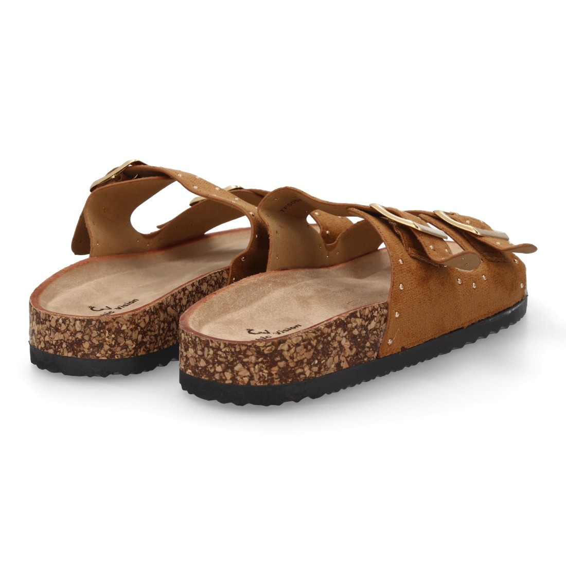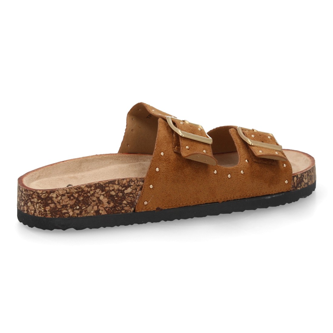 Sandalia de mujer estilo bio, doble hebilla metálica ajustable. Plantilla ergonómica plana ligera y acolchada tipo corcho, ideal para uso diario. Temporada verano.