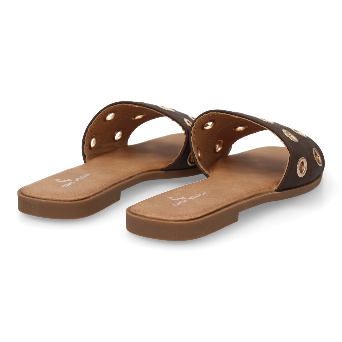 Sandalia tipo pala de mujer con diseño moderno, banda ancha en el empeine con ojales, agujeros metálicos. Suela plana ligera y acolchada, ideal para uso diario.