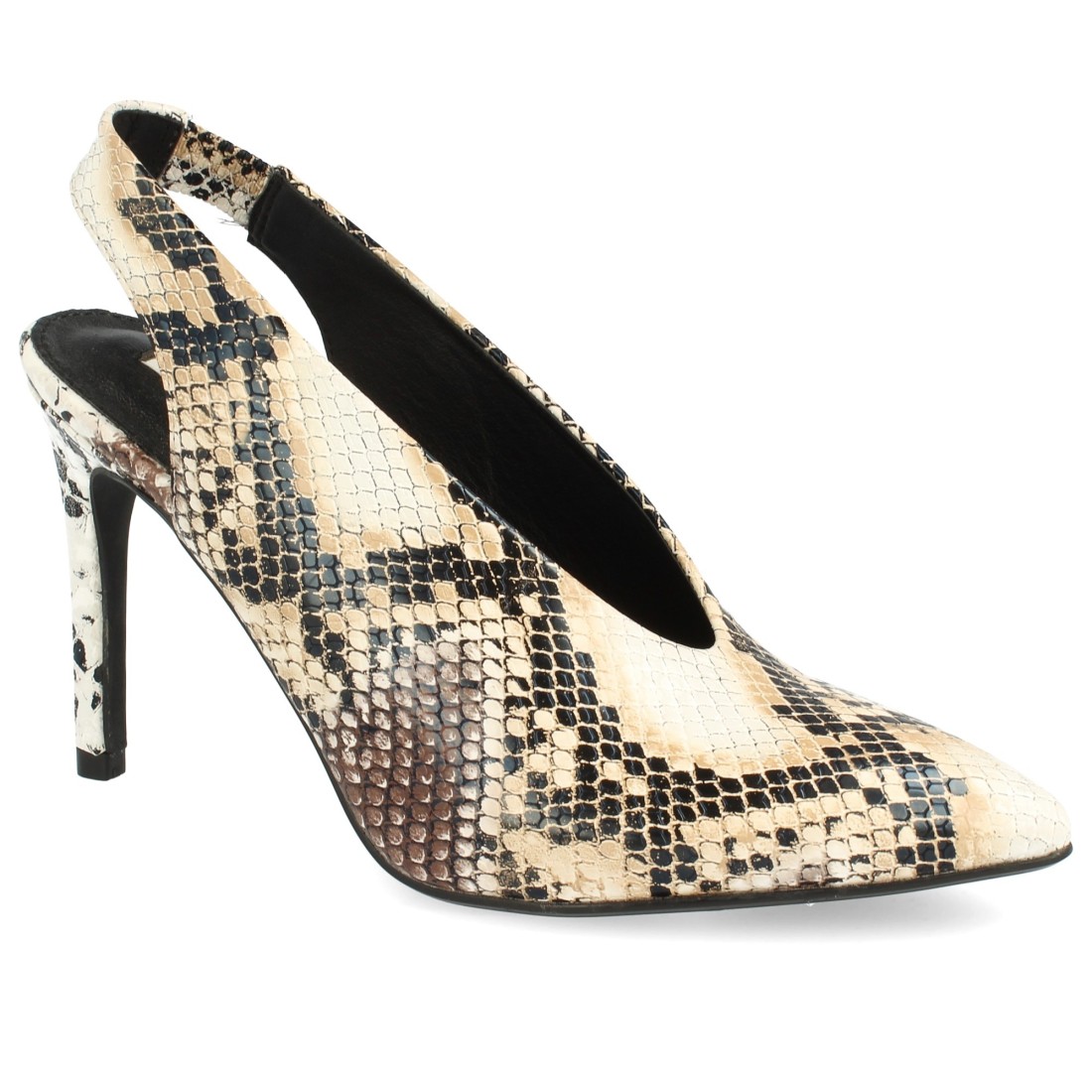 Zapato de tacón y punta finos con talón descubierto. Sujeción mediante elástico. Altura de tacón: 9 cm.