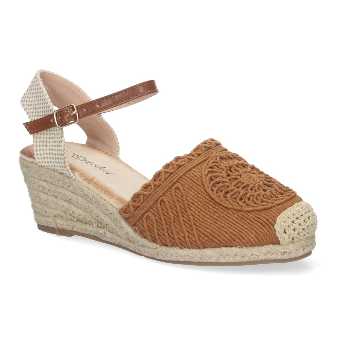 Sandalia de Cuña para Mujer, Estilo Valenciana, Forrada de Yute, Pala Bordada, y Cierre de Hebilla.