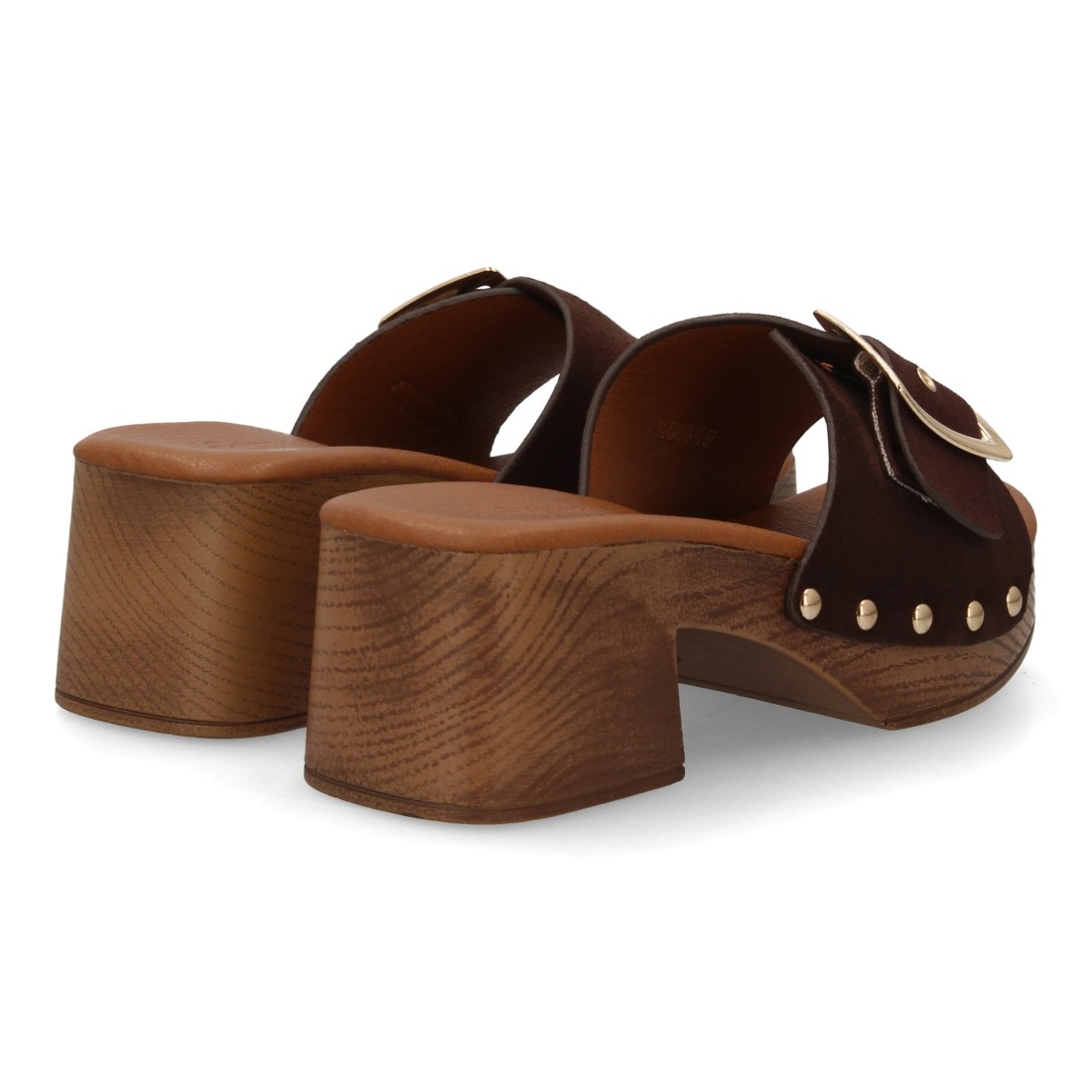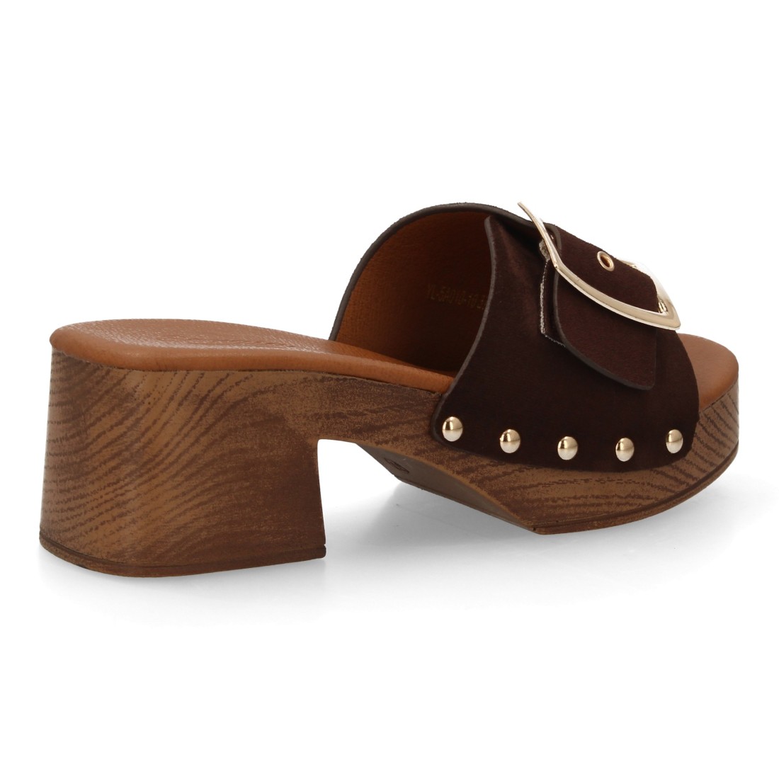 Sandalia de mujer tipo zueco con tacón estilo madera. Diseño con tira ancha, adornos metálicos y tachuelas. Calzado cómodo y ligero. Ideal para primavera verano.