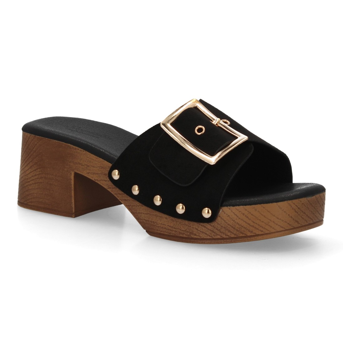 Sandalia de mujer tipo zueco con tacón estilo madera. Diseño con tira ancha, adornos metálicos y tachuelas. Calzado cómodo y ligero. Ideal para primavera verano.