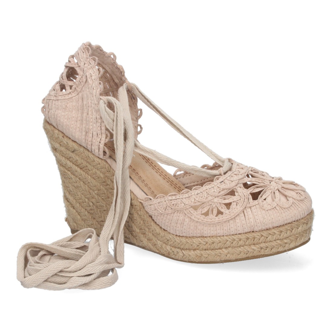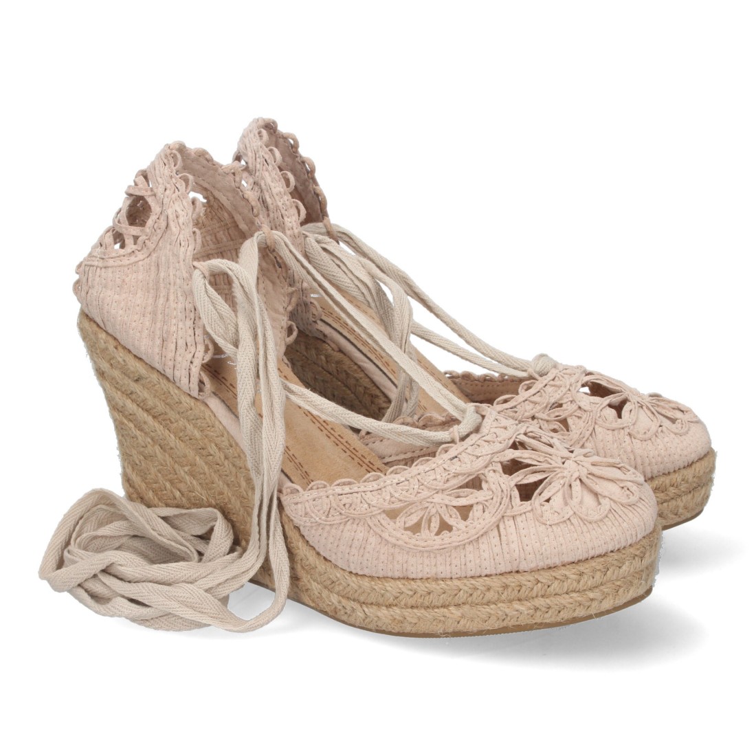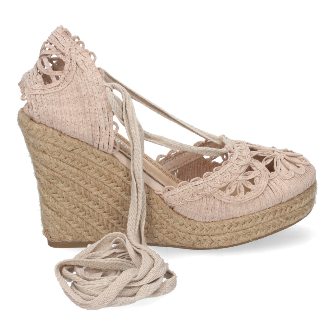 Sandalia de Cuña con Yute, Estilo Valenciana, Pala con Tiras Cosidas en Forma de Petalos de Flor, y Cierre de Cordones en el Tobillo Primavera Verano 2021