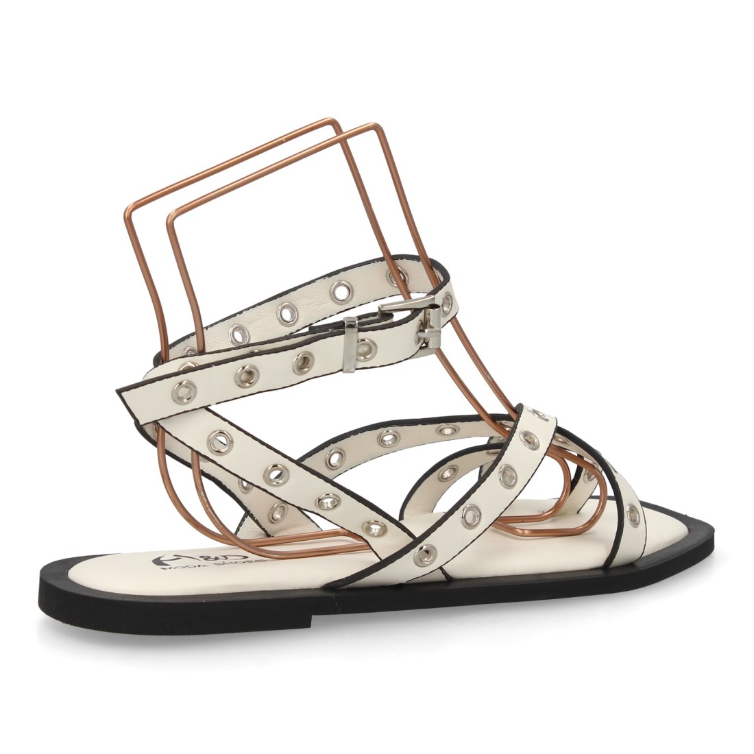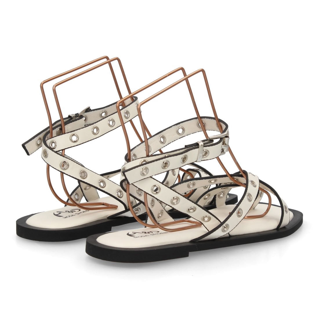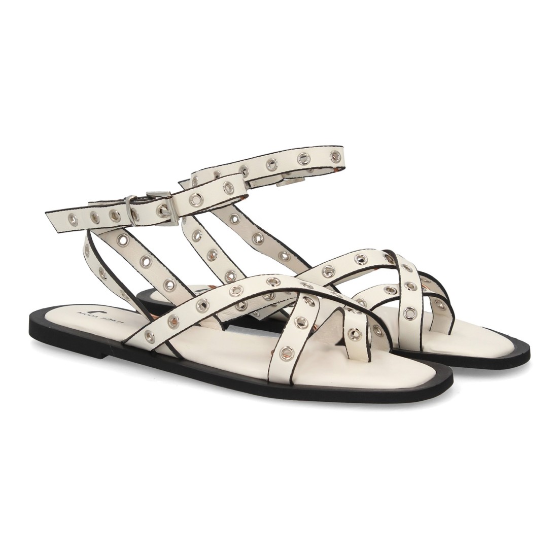 Sandalia plana para mujer con diseño de multiples tiras decoradas con ojales metálicos. Cierre ajustable de hebilla en el tobillo. Suela acolchada, cómoda y ligera, ideal verano.