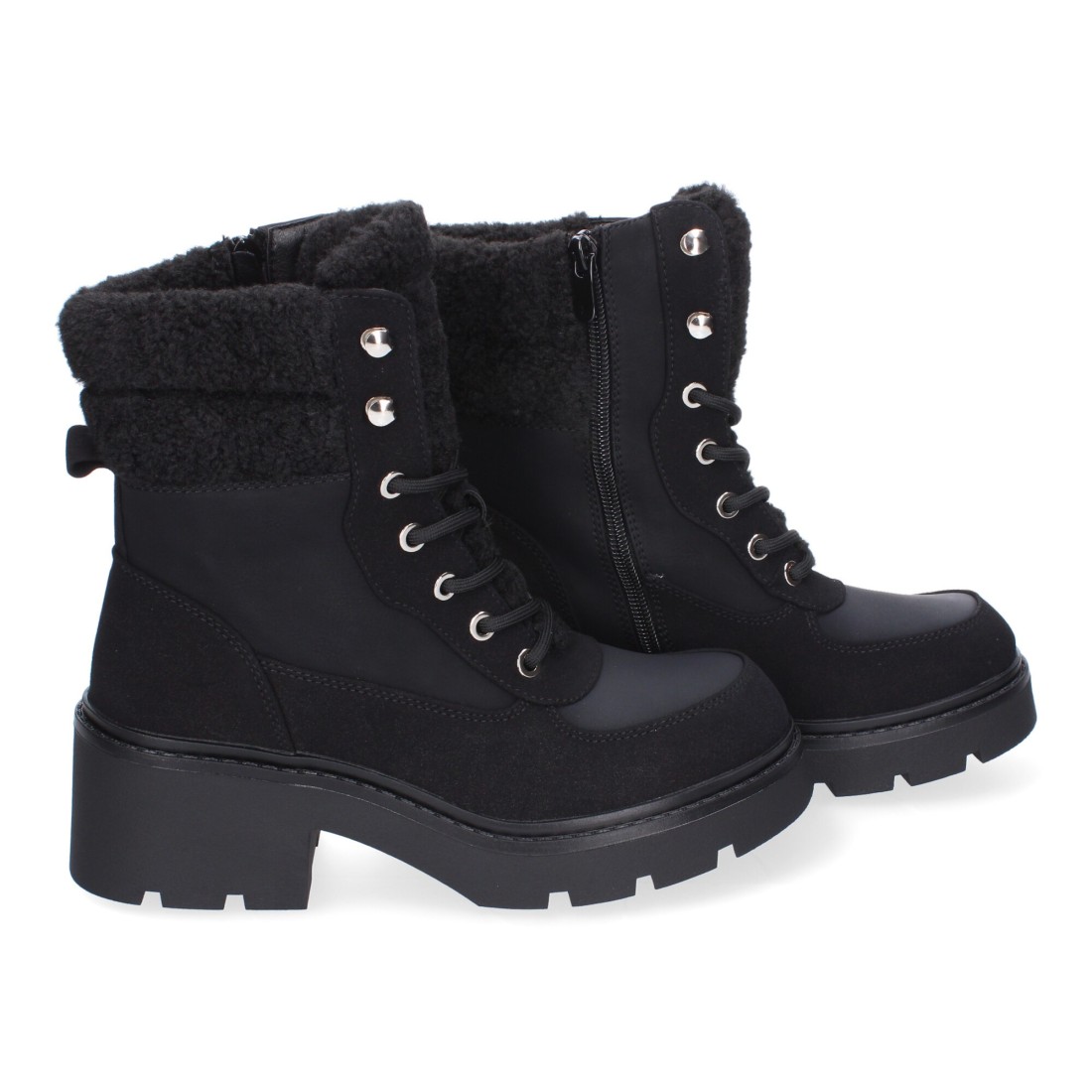Botines de Tacón para Mujer, Comodos y Elegantes, Forrados de Borreguillo, Adornos Metálicos, Puntera Redonda y Cierre de Cordones para un ajuste cómodo y seguro.