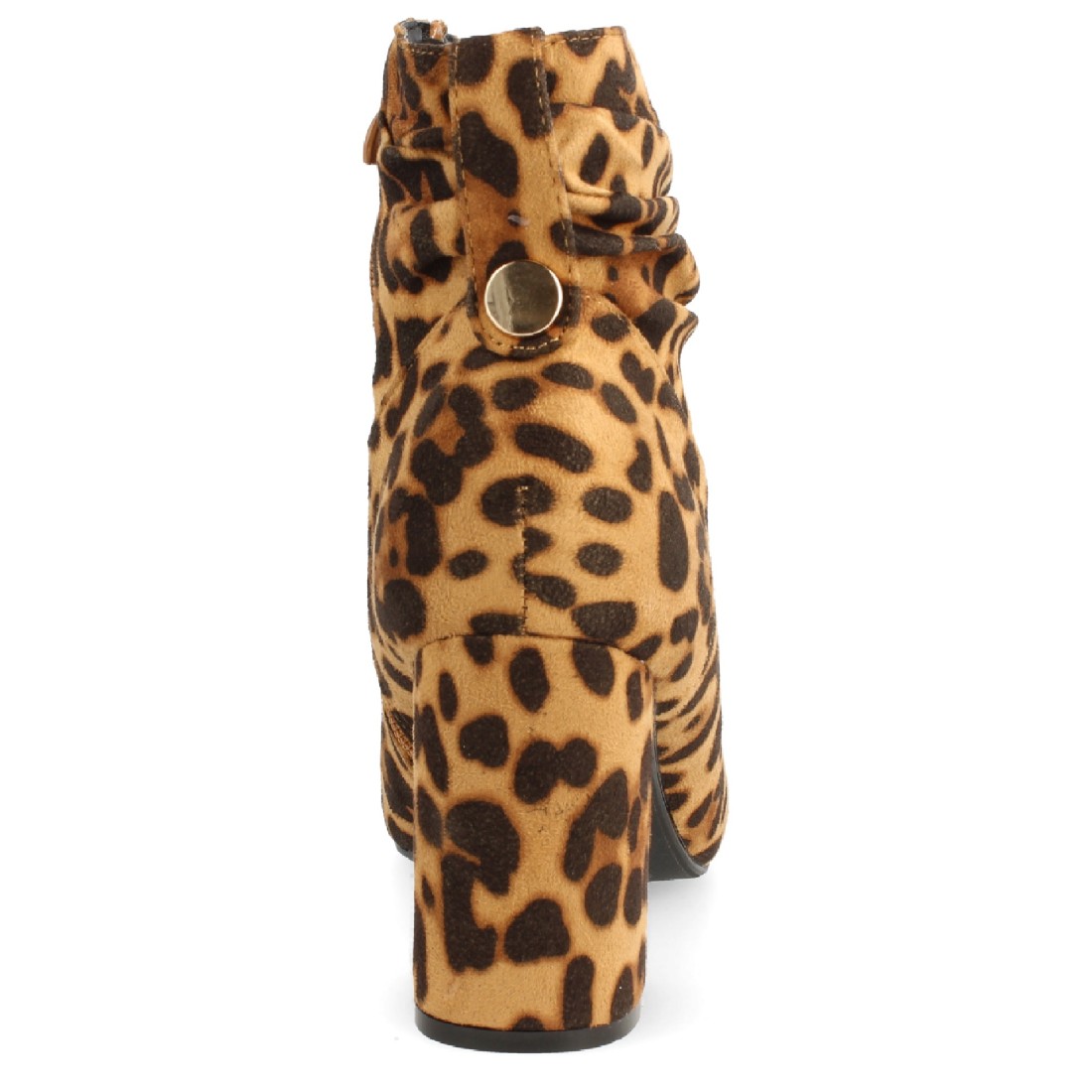 Botín de tacón ancho y punta fina, con la caña drapeada y remache metálico en la parte trasera como detalle. Cierre de cremallera en el interior. Altura del tacón: 7,5 cm.