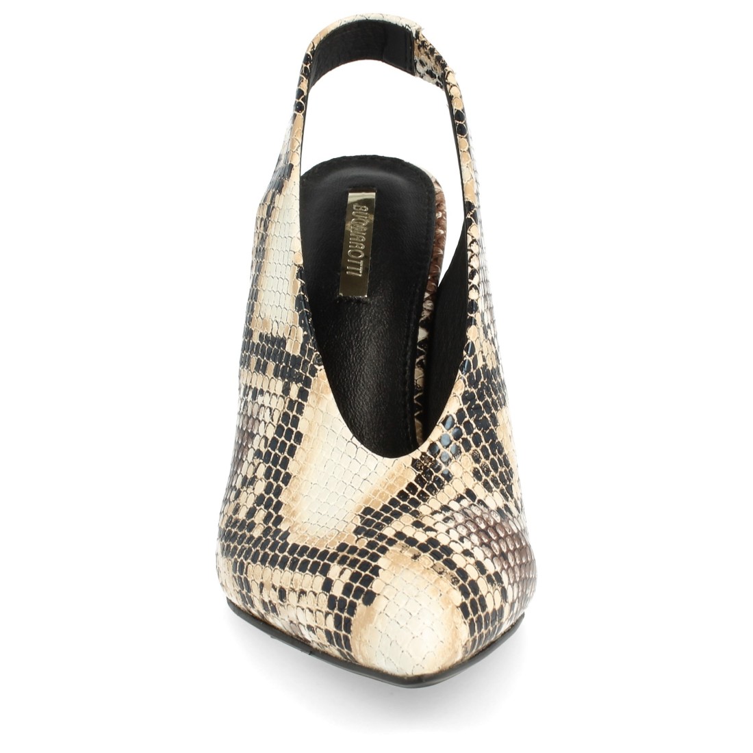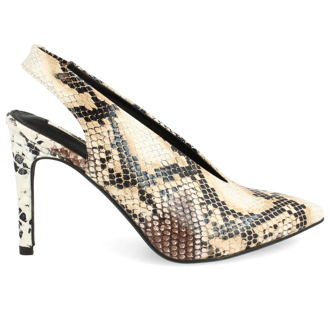 Zapato de tacón y punta finos con talón descubierto. Sujeción mediante elástico. Altura de tacón: 9 cm.