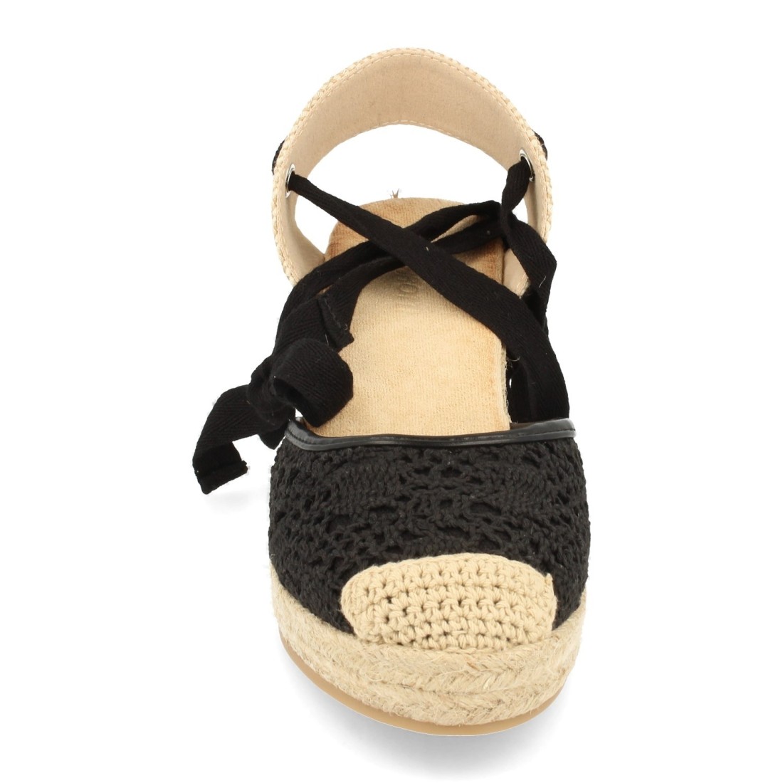 Sandalia de cuña en yute atada al tobillo con cinta. Bordado de punto.