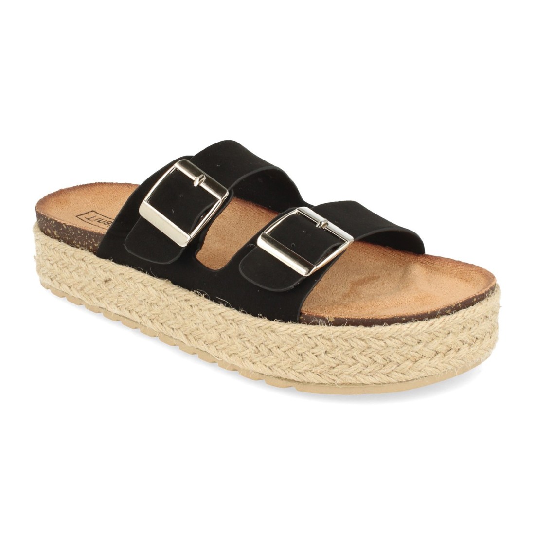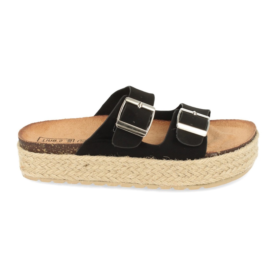 Sandalia Plana de Mujer, Forrado de Yute, con Planta Anatomica, y Hebillas en Pala, Primavera Verano 2021