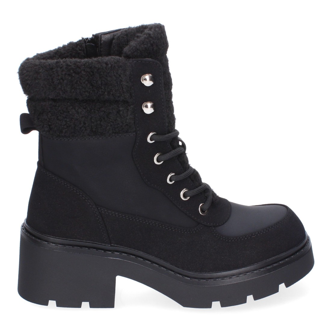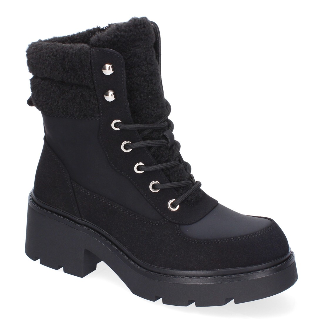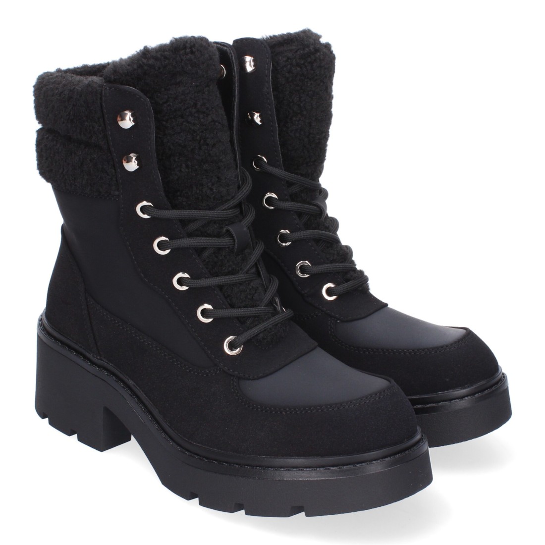 Botines de Tacón para Mujer, Comodos y Elegantes, Forrados de Borreguillo, Adornos Metálicos, Puntera Redonda y Cierre de Cordones para un ajuste cómodo y seguro.