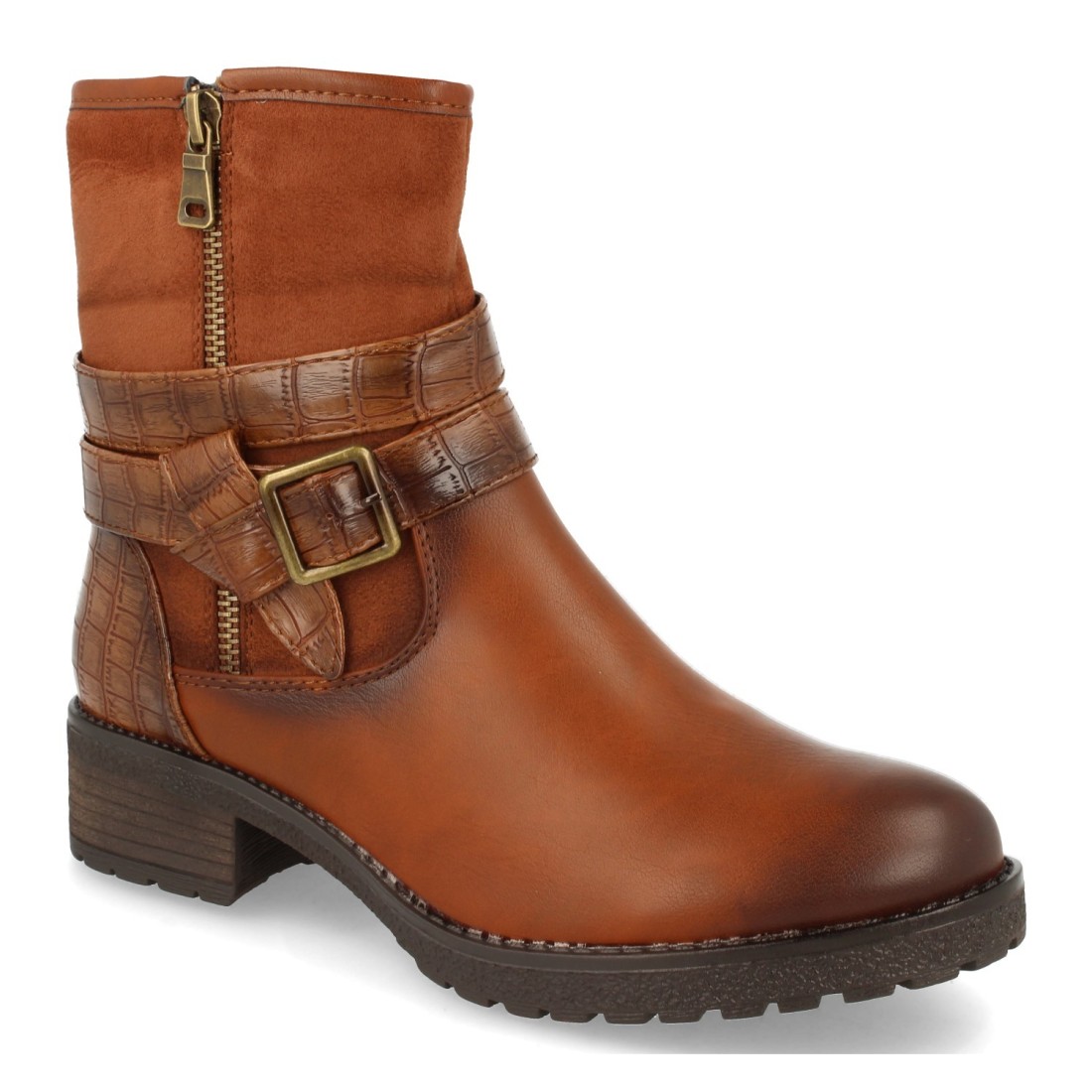 Botín de Mujer, con Hebilla, Estampado de Cocodrilo en Talon y Tiras, Caña Blanda, y Cierre de Cremallera Otoño Invierno 2020
